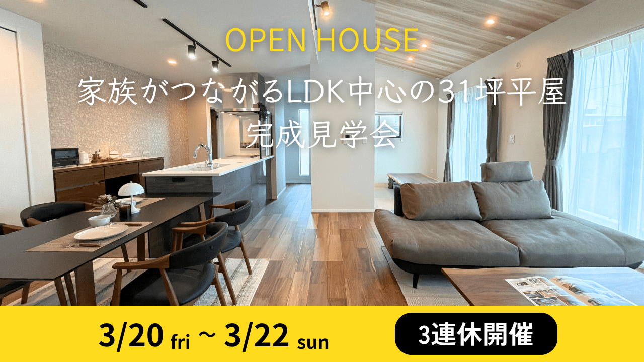 - 2026.03.133/20(金)~3/22(日)家族がつながるLDK中心の31坪平屋/完成見学会