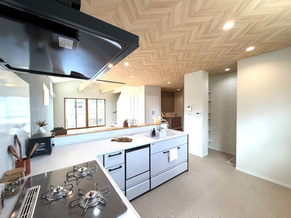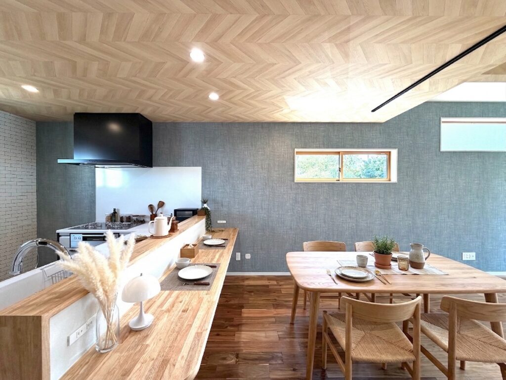 天井のヘリンボーン柄が目を引く、まるでカフェのような洗練された空間を演出しました。
