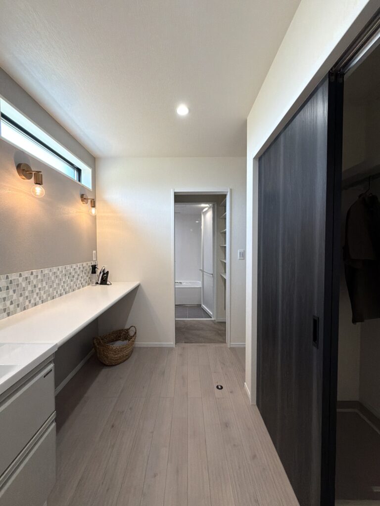 帰宅後の手洗いから洗濯動線までが一直線に繋がる動線は、