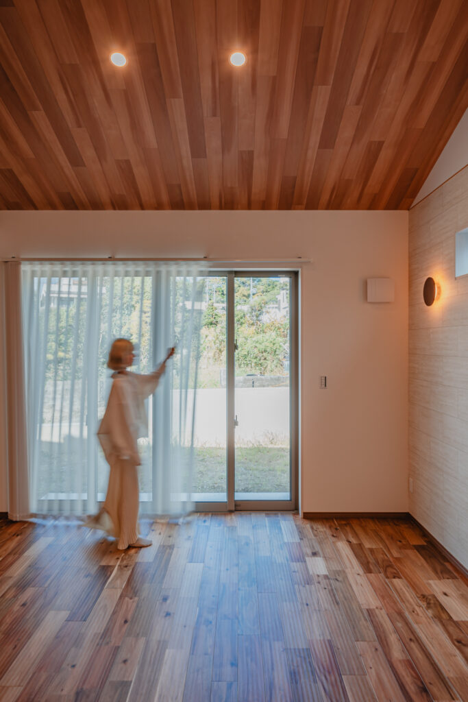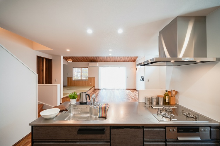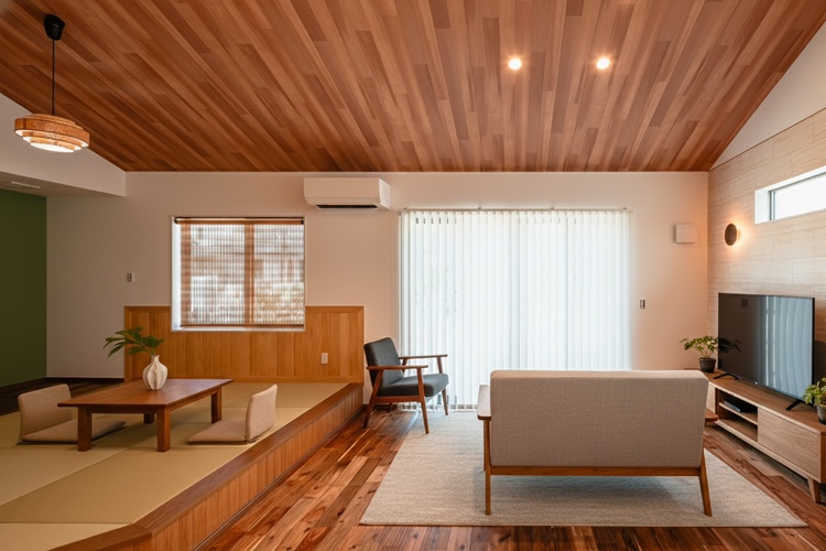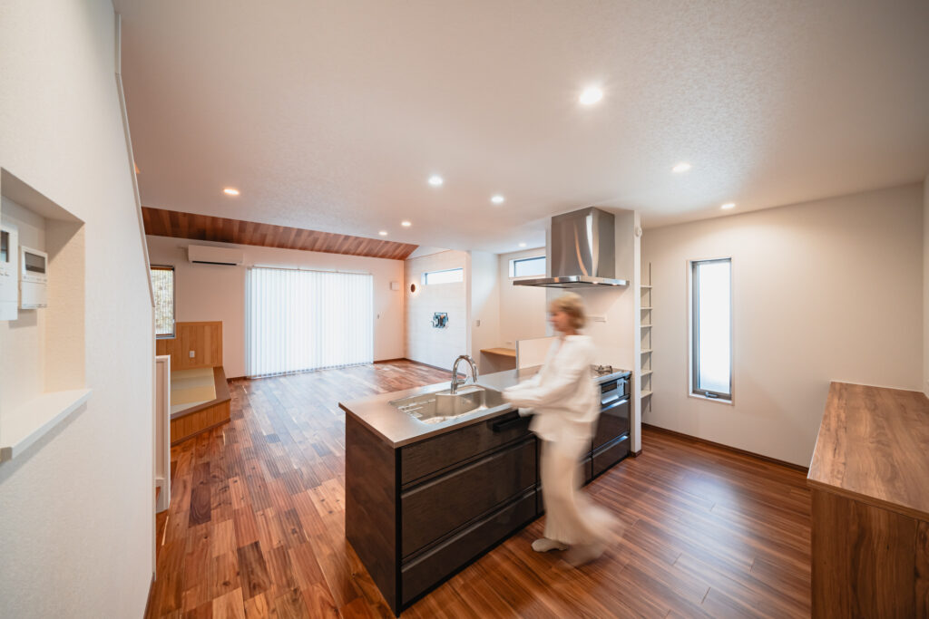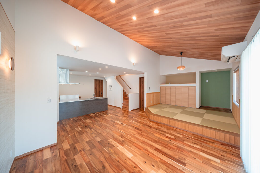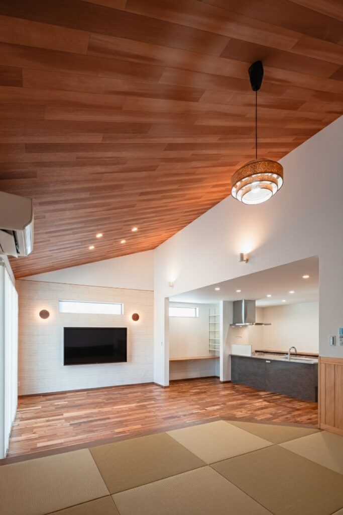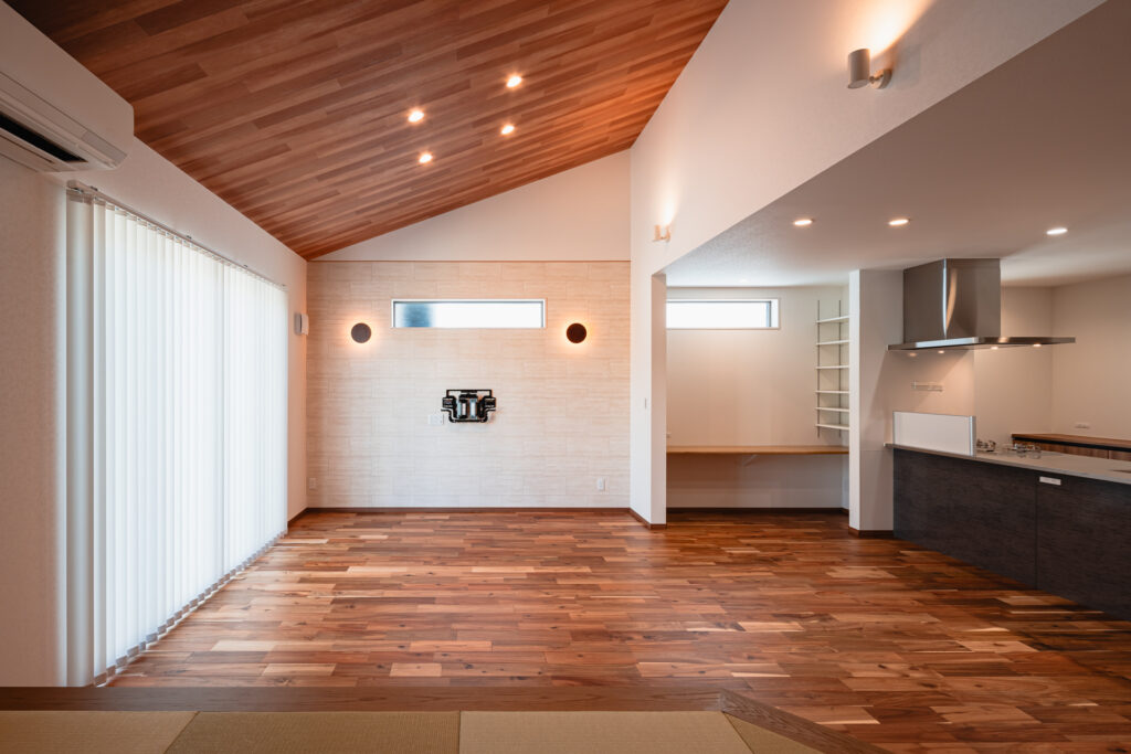 30帖と圧巻の広さと開放感をもたらしたLDK。そして屋根の形状に沿った勾配天井で拡がりを実現。和モダンなお洒落な空間が広がります。