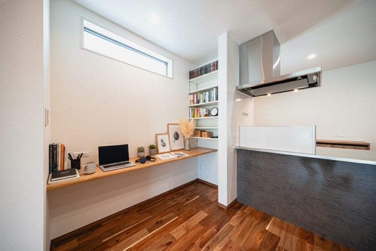 ダイニング後方には、ワークスペースを設けました。壁にはマグマジックを仕込んでいるので、マグネットボードのようにお使いいただけます。