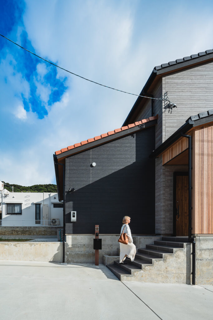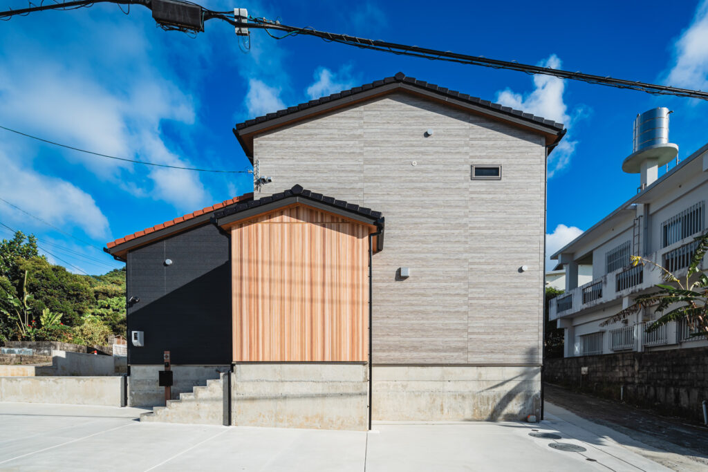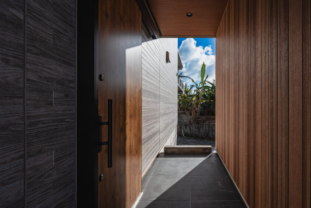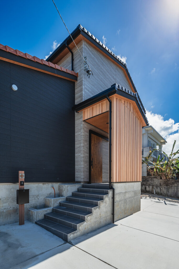 無機質なコンクリートの質感にリアルな木目の風合いを施したグレーの外壁に焼杉の風合いを施した黒の外壁。そして玄関周りは、木目調の外壁をカスタムしてモダンな雰囲気に仕上げました。