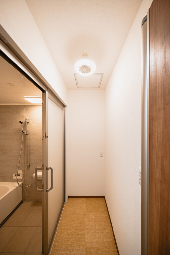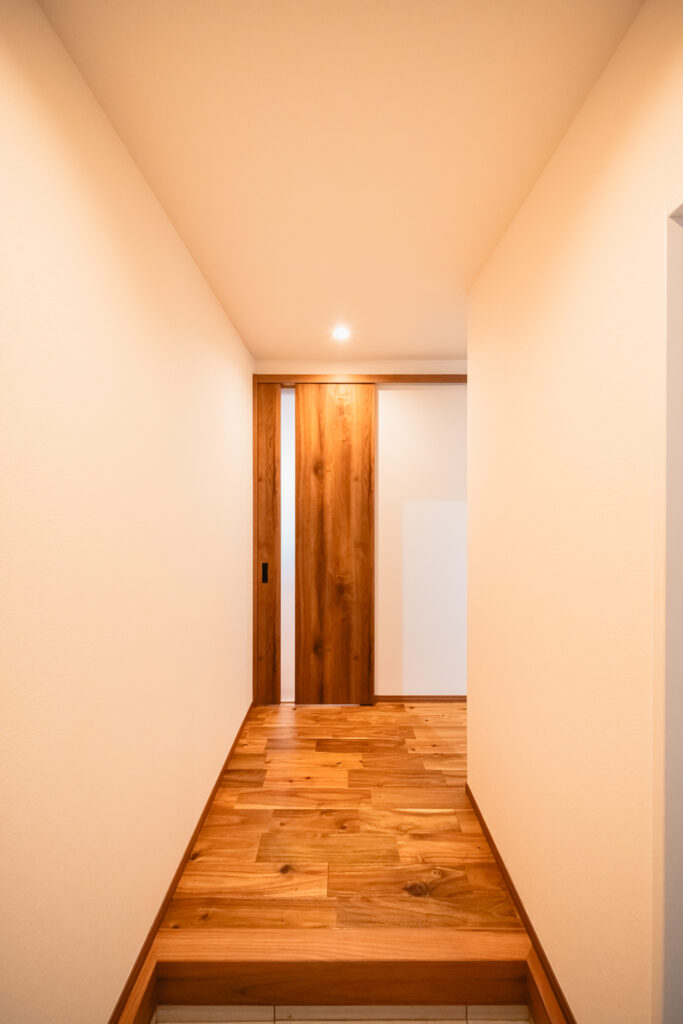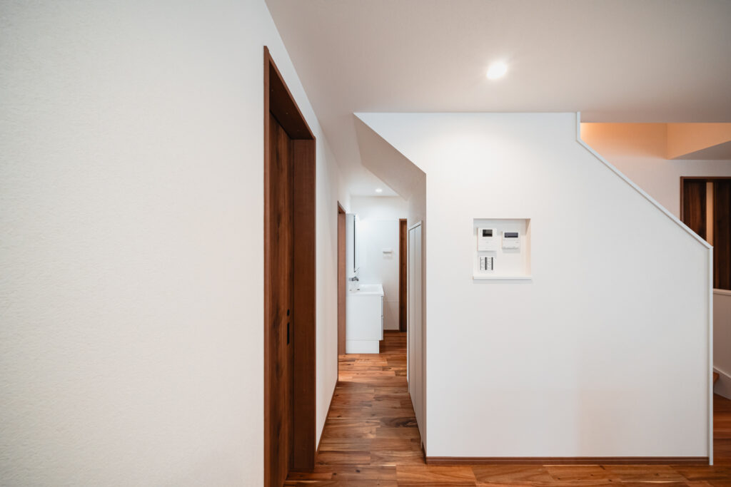 そして、キッチンから階段下をぐるっと回ると水回り動線へつながります。