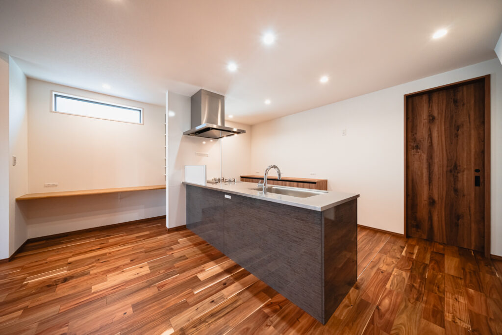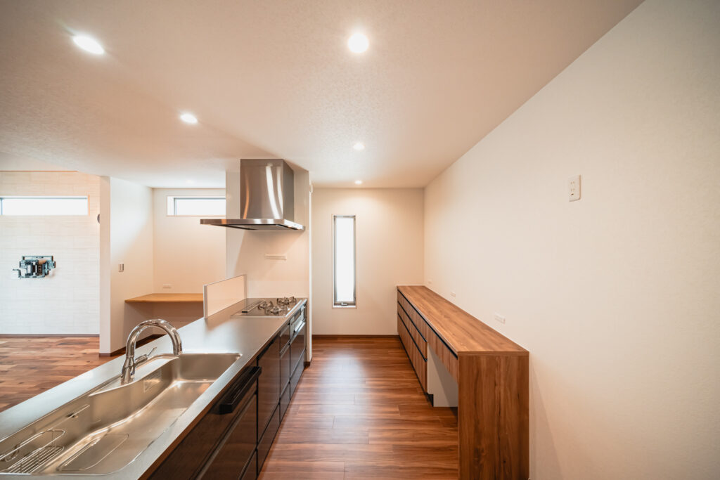 対面キッチンに対して垂直に配置する予定のダイニング。
