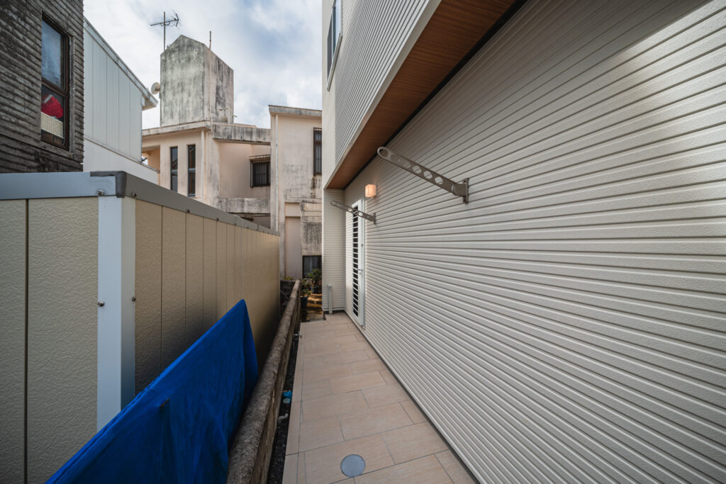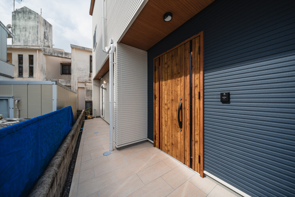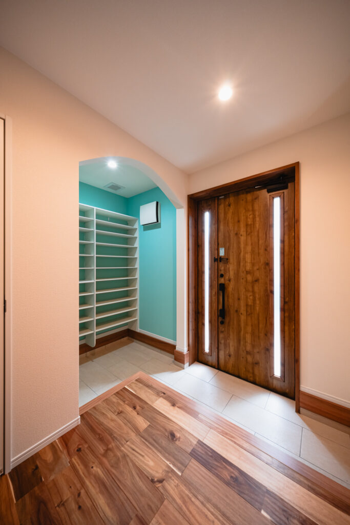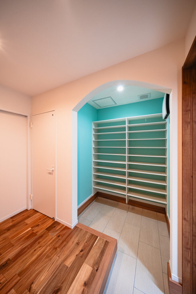 アーチの奥には鮮やかなブルーに目を引くシューズクロークがお出迎え。L字型で奥行きがあり、ベビーカーや自転車などをスムーズに収納できます。