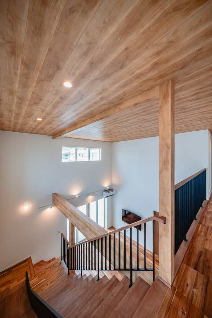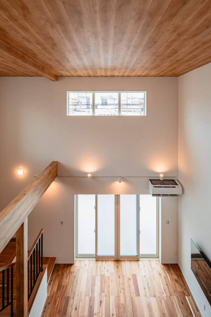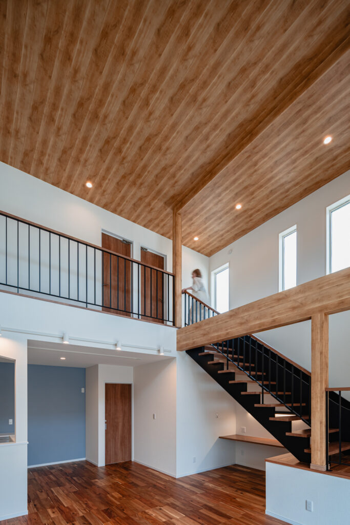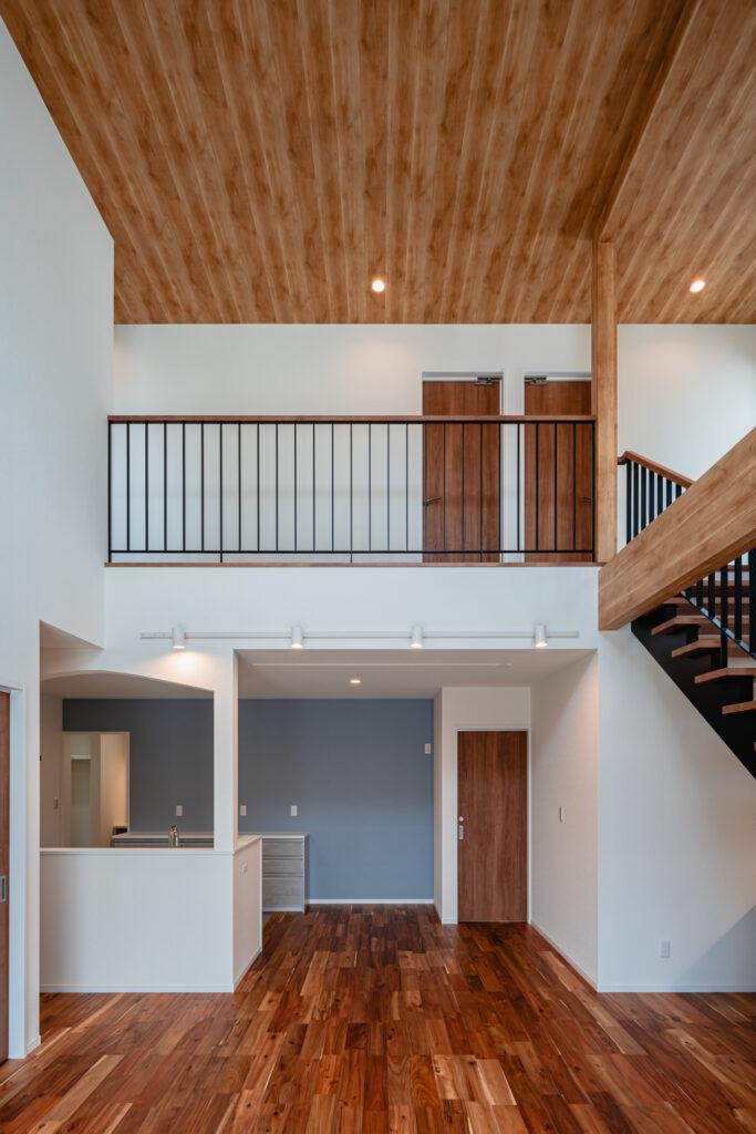 26帖のLDKは吹き抜けで拡がりを実現。アカシアの無垢材に天井や柱、ドアなども木目調で統一する事であたたかな空間が広がります。