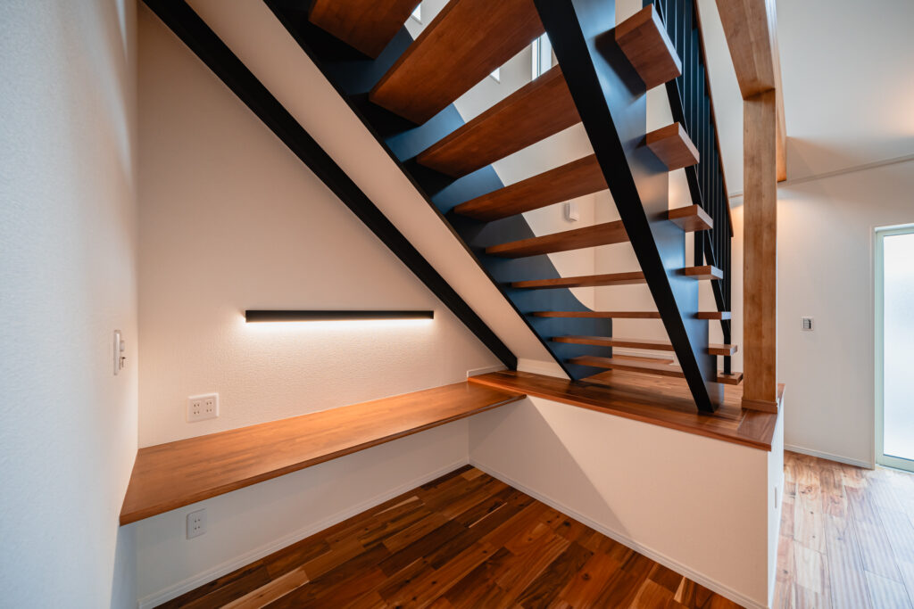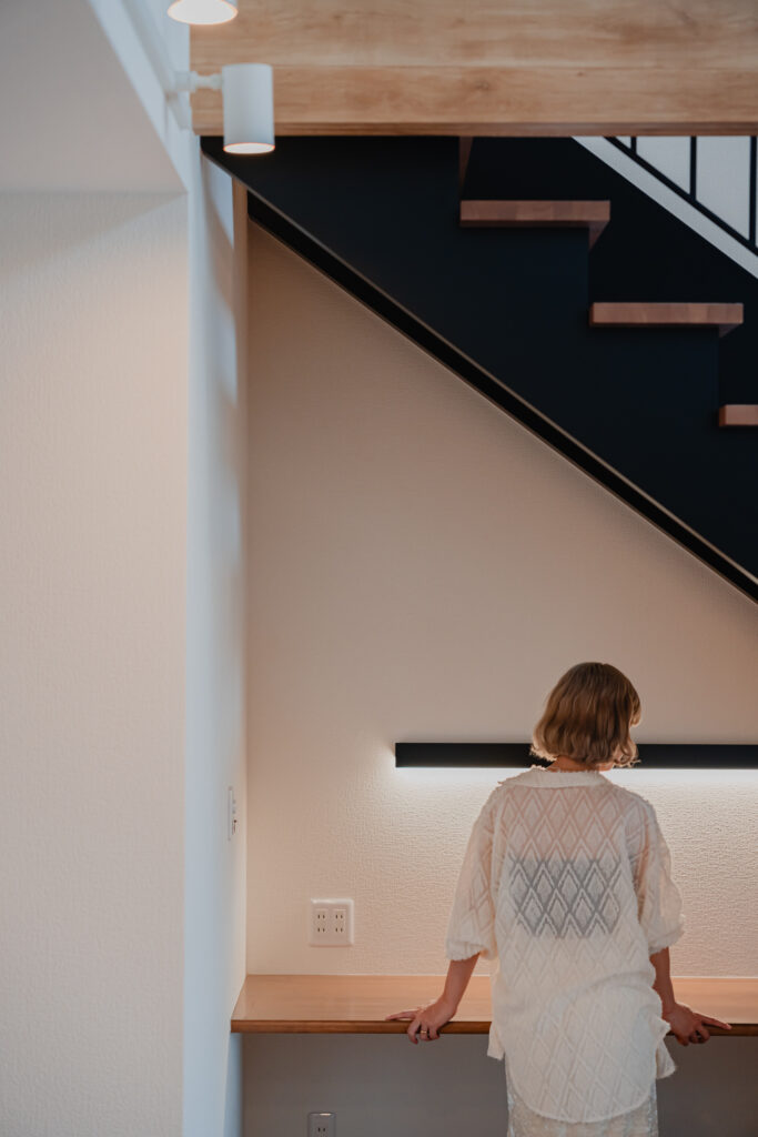 階段下スペースを活用したスタディースペース。奥行きがある事でリビングにいながらも、こもり感があり落ち着いて作業ができます◎