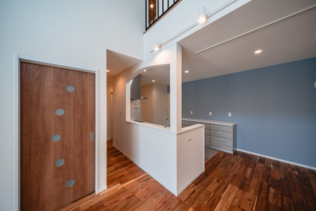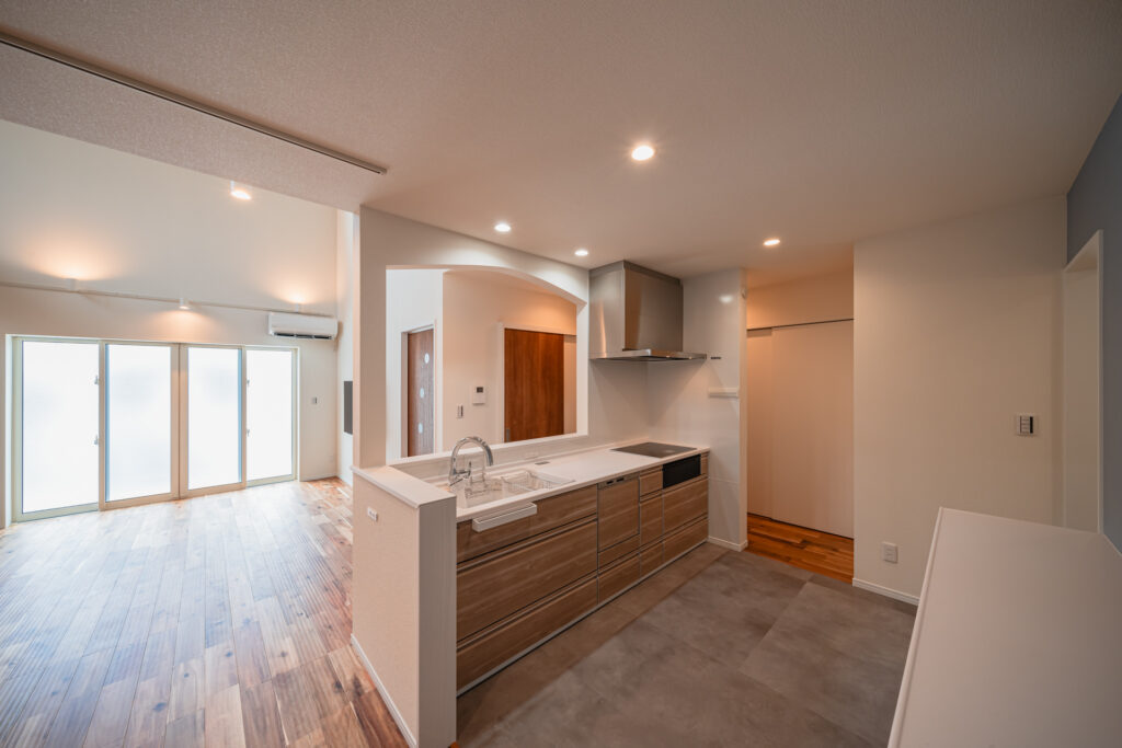 シューズクロークと同様、アーチの開口をキッチンにも採用しました。リビングで過ごすご家族の様子を見ながら支度ができます。