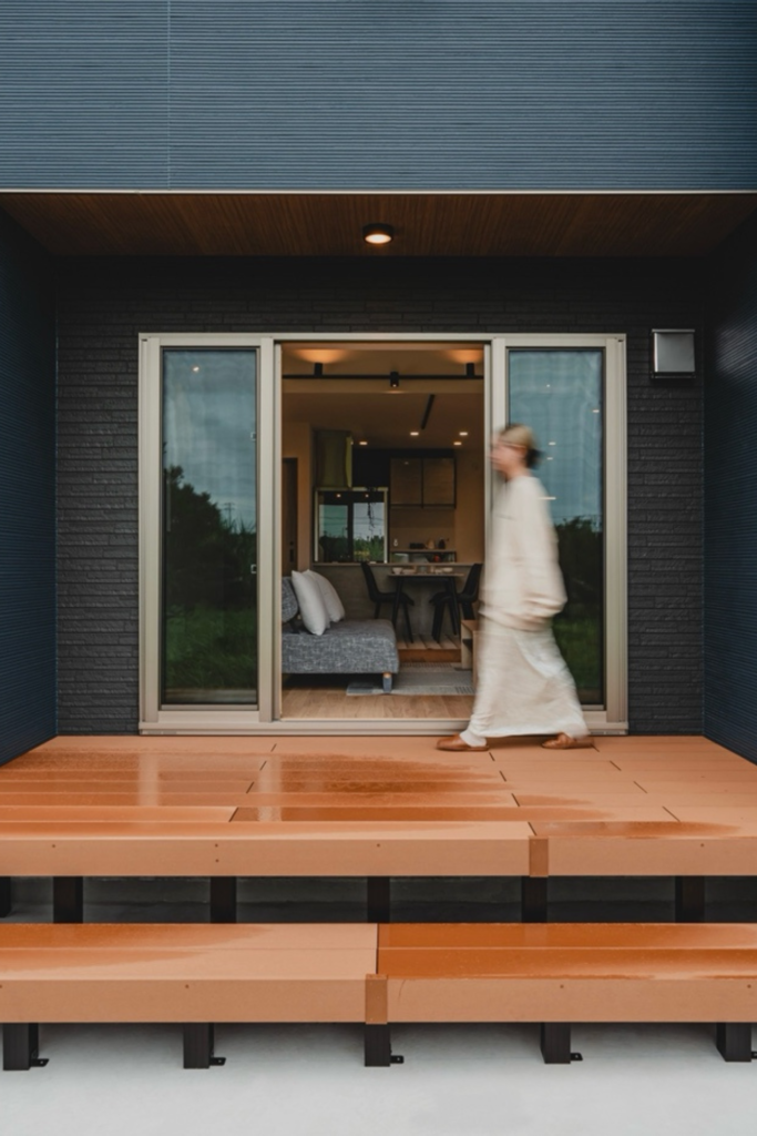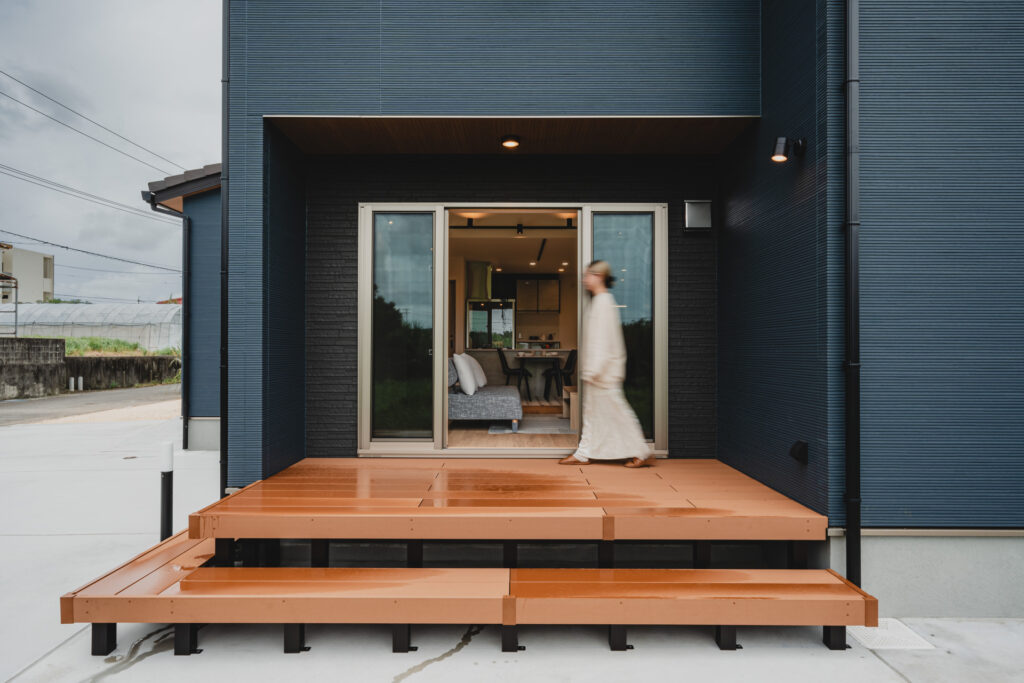 ・カラー:アトランティックチタンブルー(メイン) / グレイズチタングレー(玄関周り) / ブリュレチタンブラック(ウッドデッキ周り)