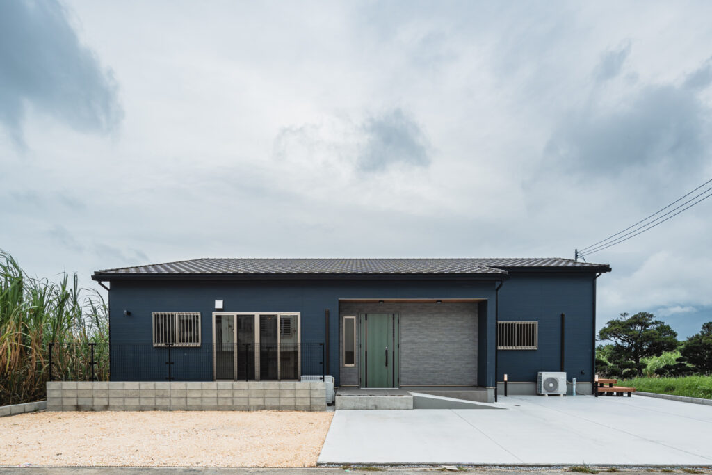 深いネイビーの外壁が印象的な平屋のお住まい。周囲の豊かな自然に溶け込みながら、落ち着きあるデザインに仕上がりました。