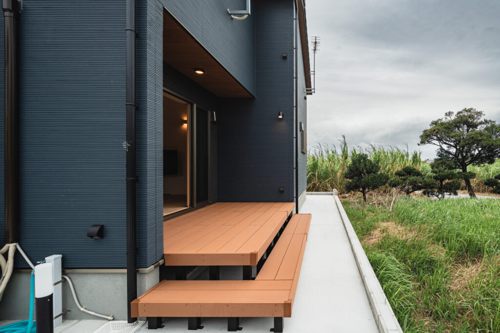 玄関側はすっきりとしたアプローチを確保し、雨の日でもスムーズに出入りできる動線を計画。横側にはリビングとつながるウッドデッキを配置し、“外時間”を心地よく楽しめる空間をつくりました。