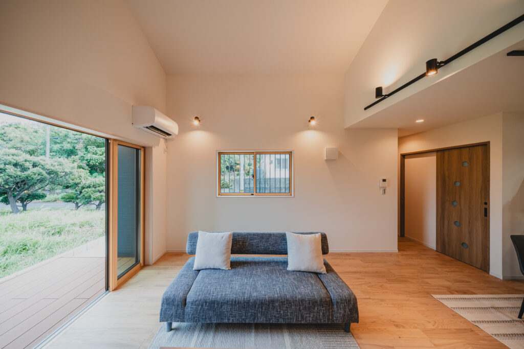 リビングの大きな窓からは、緑豊かな景色が広がり、室内にいながら自然を感じられる開放的な設計。勾配天井が生み出す拡がりと、季節ごとに移り変わる自然の表情を家の中で楽しめる特別な空間です。