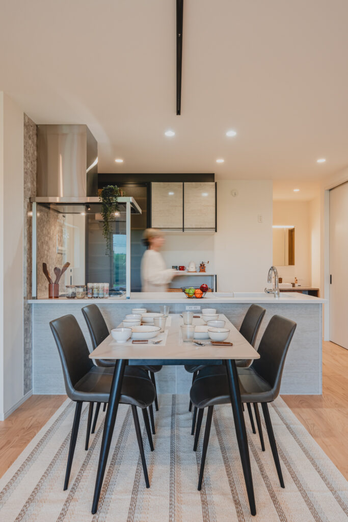 リビングとひと続きになったダイニングは、テーブルの周りには広めのスペースを確保し、配膳や片付けの動きがスムーズに行えるよう計画しました。