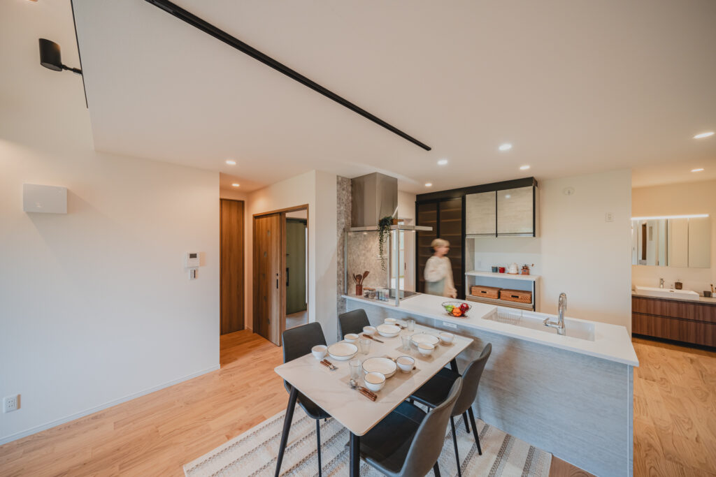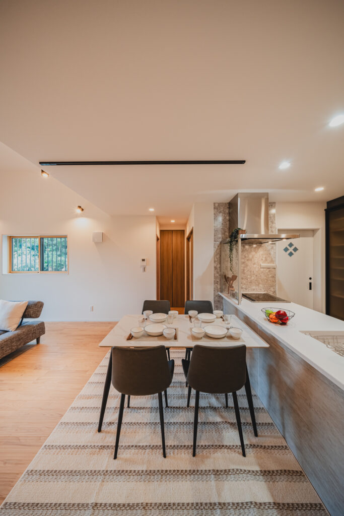又、キッチン・ダイニング・リビングを一直線につなげたレイアウトで、家族が自然と集まり、会話が生まれる暮らしを叶えています。