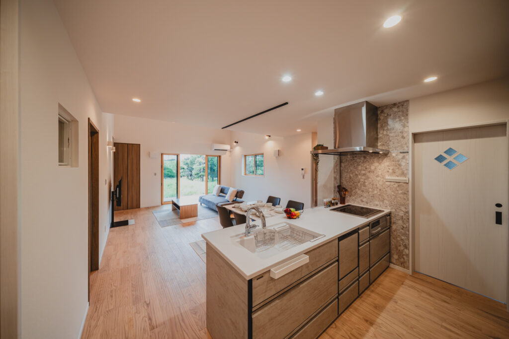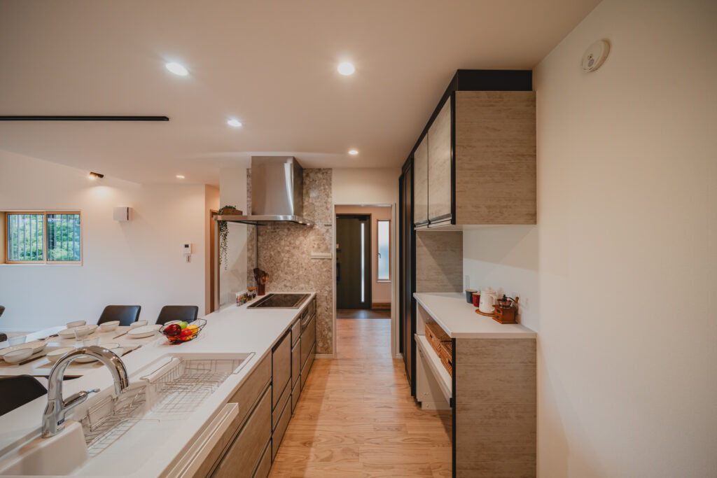 キッチンは、料理中でも家族の顔を見ながら過ごせる対面スタイル。背面にはたっぷりの収納棚を確保しました。