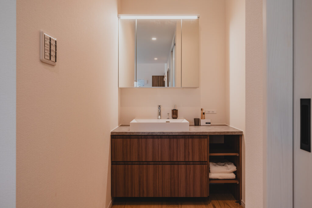 キッチンのすぐ後方には、アイカの洗面台を配置しました。モルタル調の天板と落ち着いた木目扉が、LDKのインテリアとも自然に調和し、生活感を抑えながら上質な雰囲気を演出。