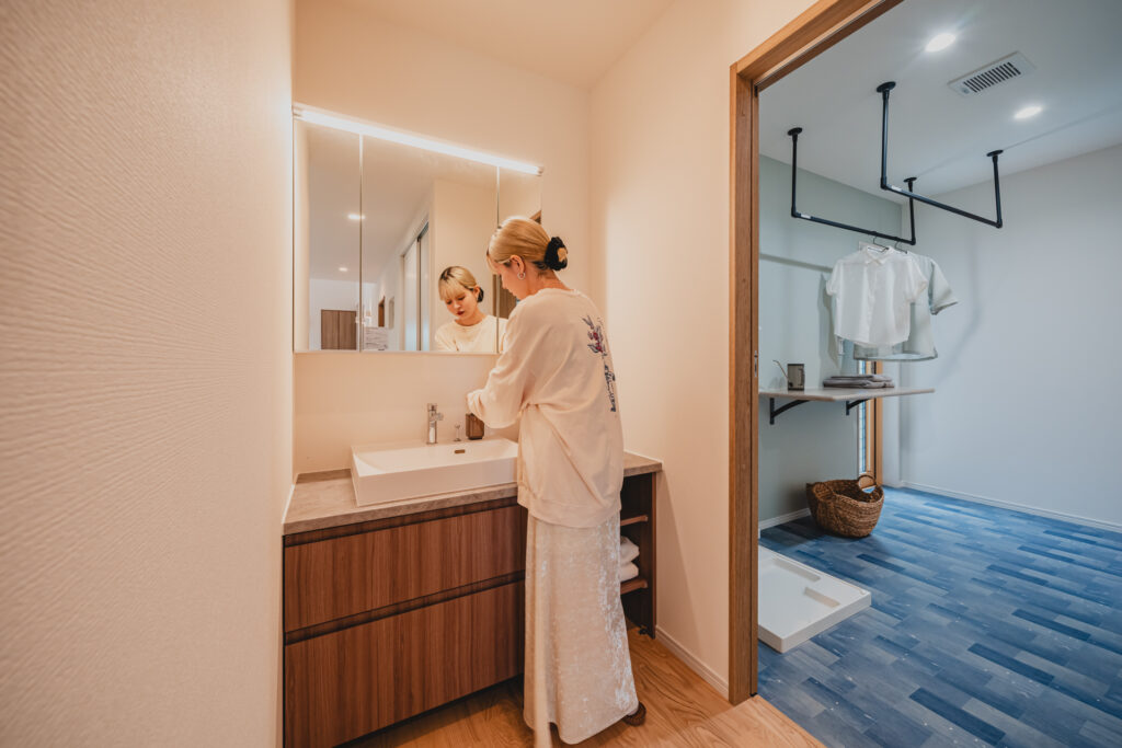 洗面台からすぐにつながるランドリールームは、毎日の家事を大きく助けてくれる“家事効率の中心”となる空間です。