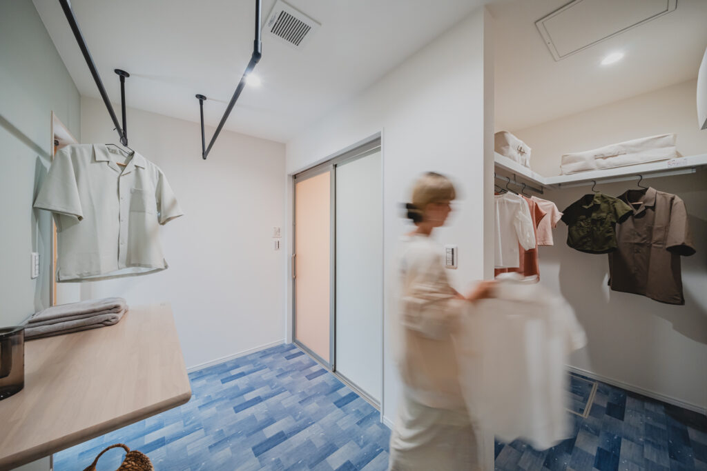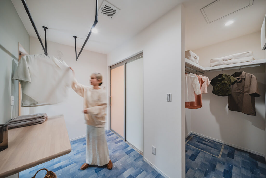 ハンギングバーを設置し、天候に左右されずいつでも快適に洗濯ができる仕様に。取り込んだ衣類はすぐ隣のファミリークローゼットへ収納でき、「洗う → 干す → しまう」がワンルームで完結します。