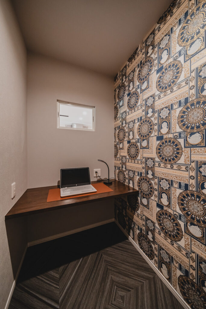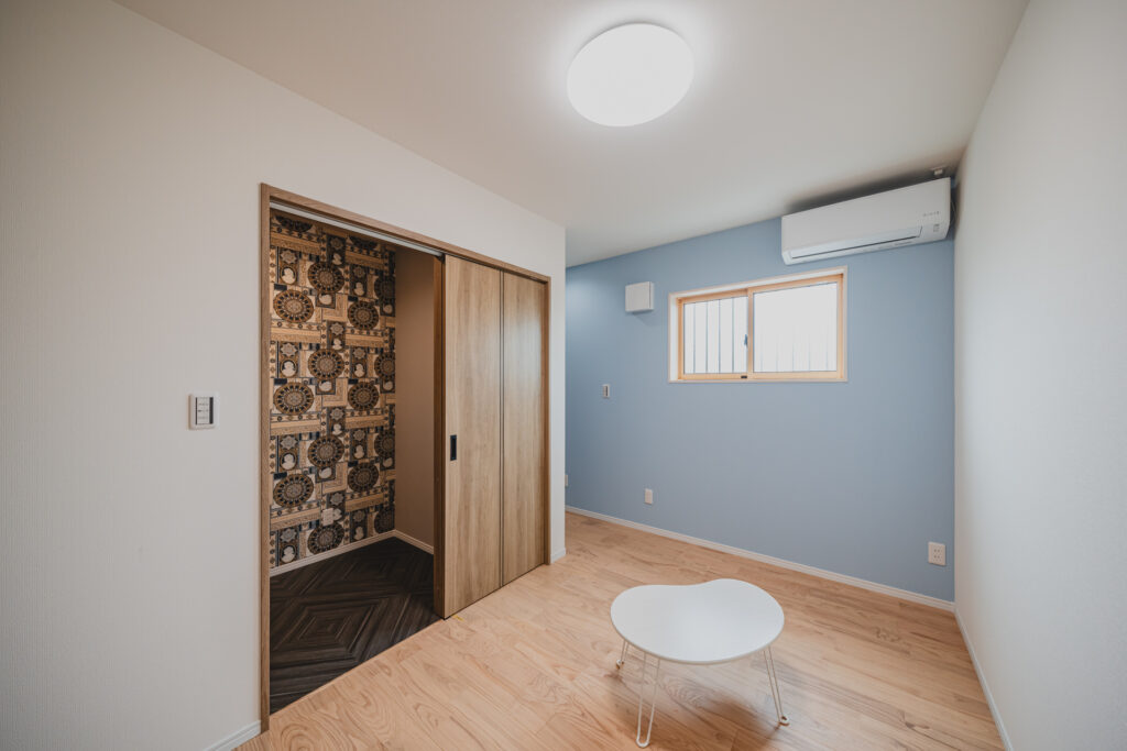 柔らかなブルーのアクセントクロスを取り入れた寝室。その隣には個性的な柄クロスで仕上げた書斎コーナーを設置しました。ちょっとした書類整理や在宅ワークにも活躍します。