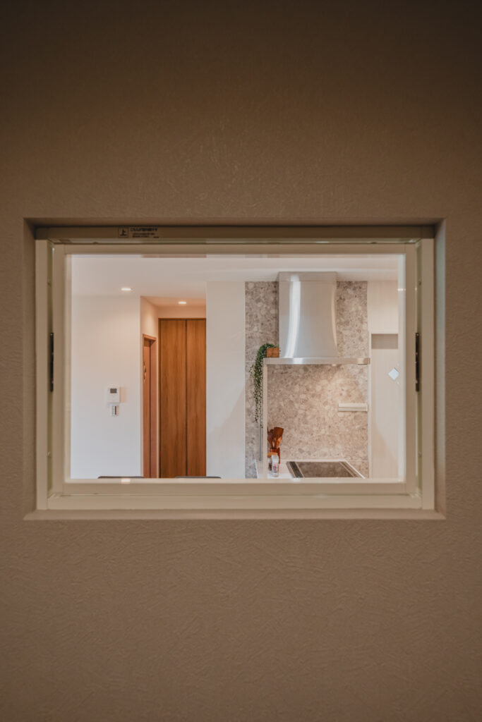 書斎には小窓を設け、キッチン側と視線がつながる工夫も。家族の気配を感じつつ、程よいこもり感で作業に集中できる居心地の良い空間となりました。