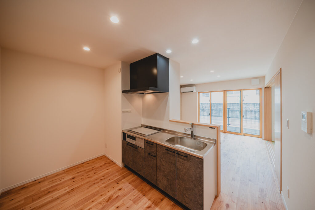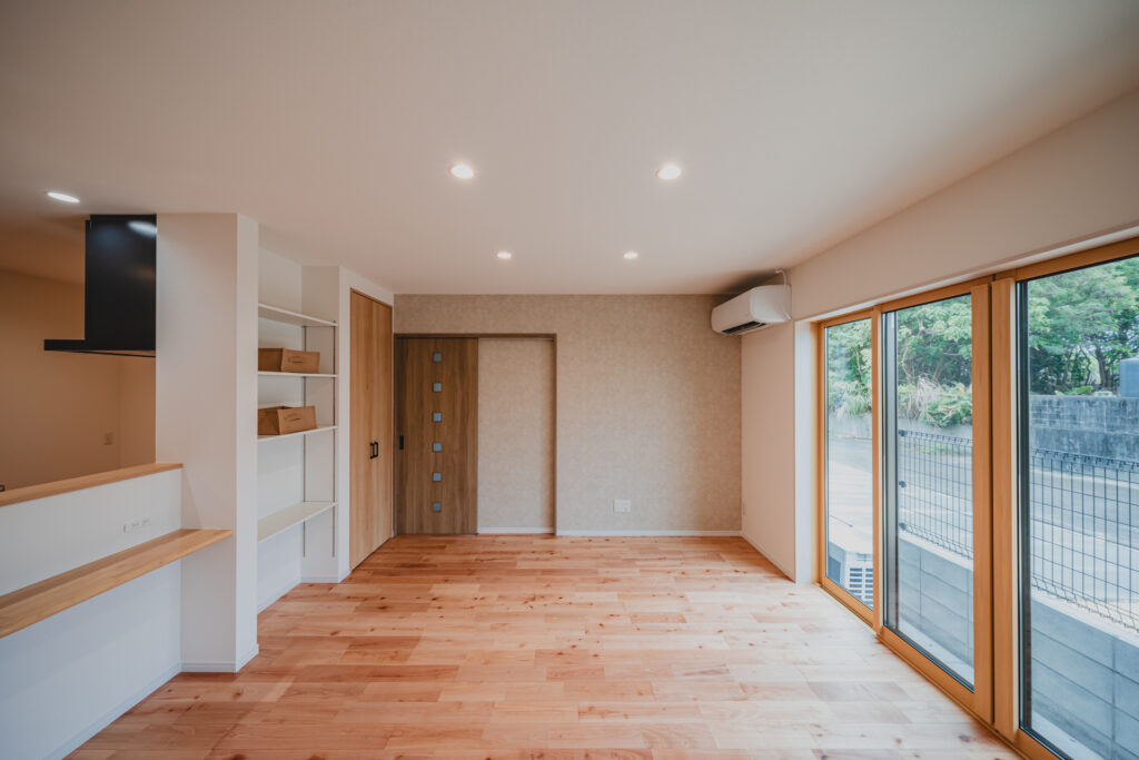 親世帯のLDKは、約15帖のゆとりある空間。大きな窓からやわらかな光が入り、毎日の暮らしを穏やかに彩ります。LDKがコンパクトな動線でまとまっているため、無理なく過ごせる“暮らしやすいサイズ感”が魅力です。