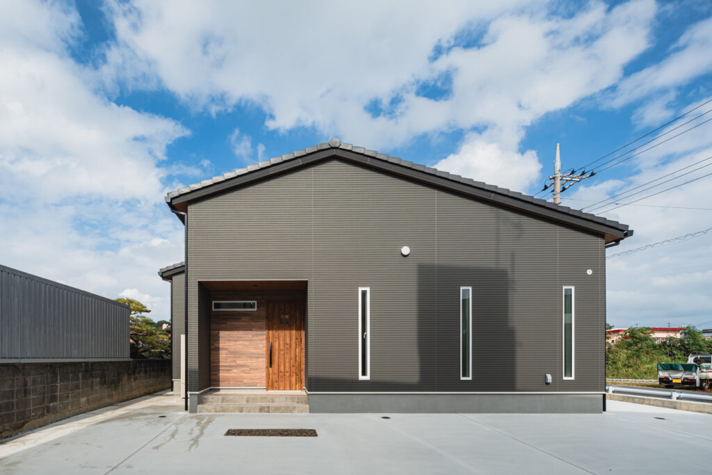 濃いグレーの外壁が目を引く、シンプルで落ち着いた佇まいの平屋住宅です。玄関まわりには木目を取り入れ、外壁とのコントラストでやさしい表情をプラス。奥まった配置にすることで、雨の日でも使いやすく、ほどよいこもり感も感じられます。縦長のスリット窓や大きな掃き出し窓が外観のアクセントとなり、室内にしっかりと光を取り込める点もポイントです。