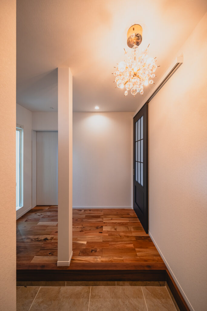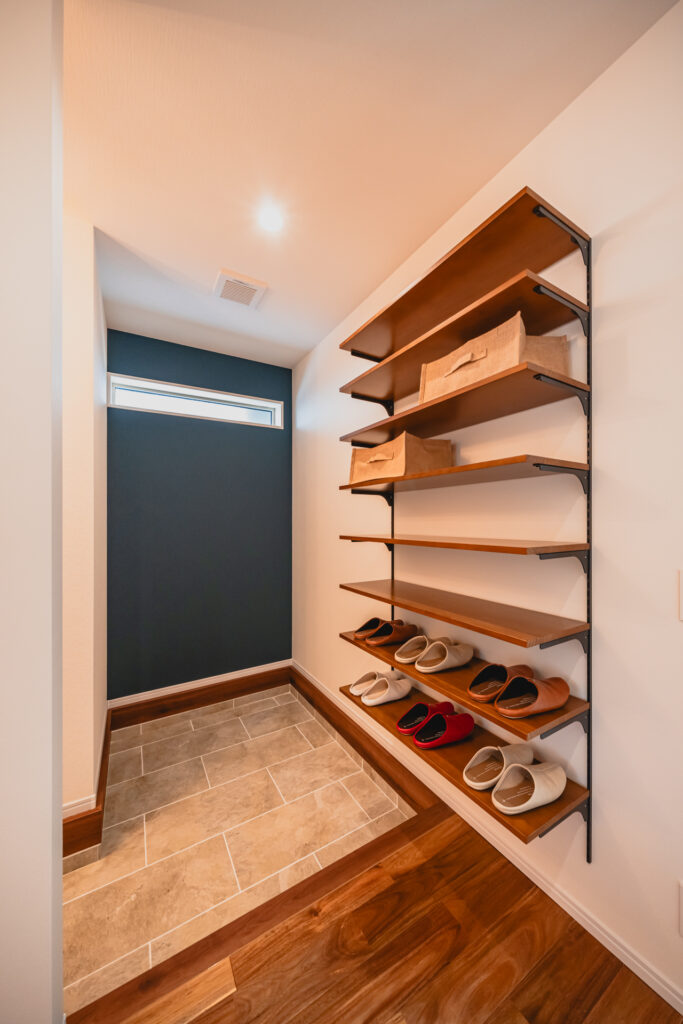 やさしい光に包まれる、こだわりの玄関空間。玄関脇には、オープンタイプのシューズ収納を設けました。見せる収納としても楽しめる仕上がりに。靴の出し入れがしやすく、日常使いのしやすさにも配慮しています。