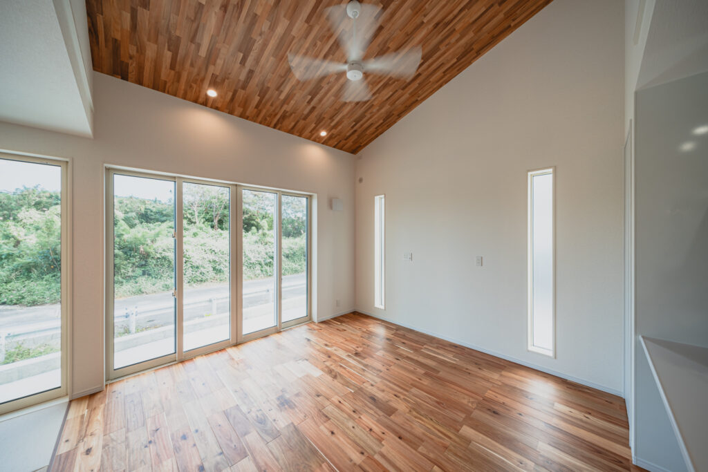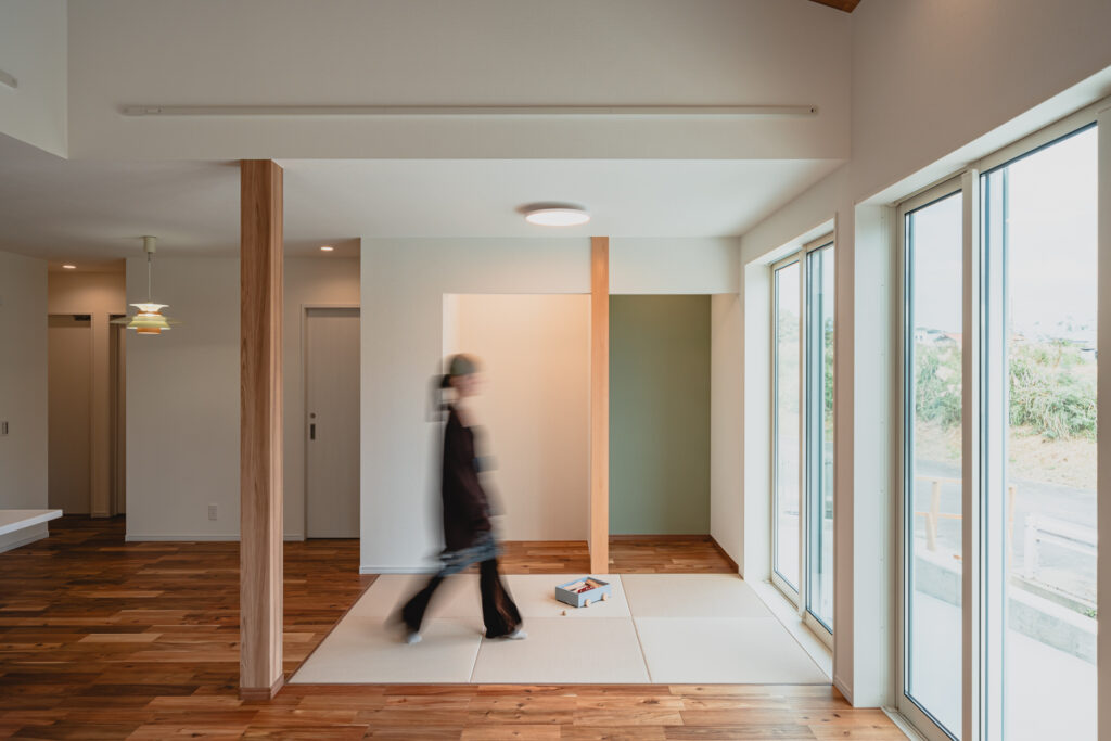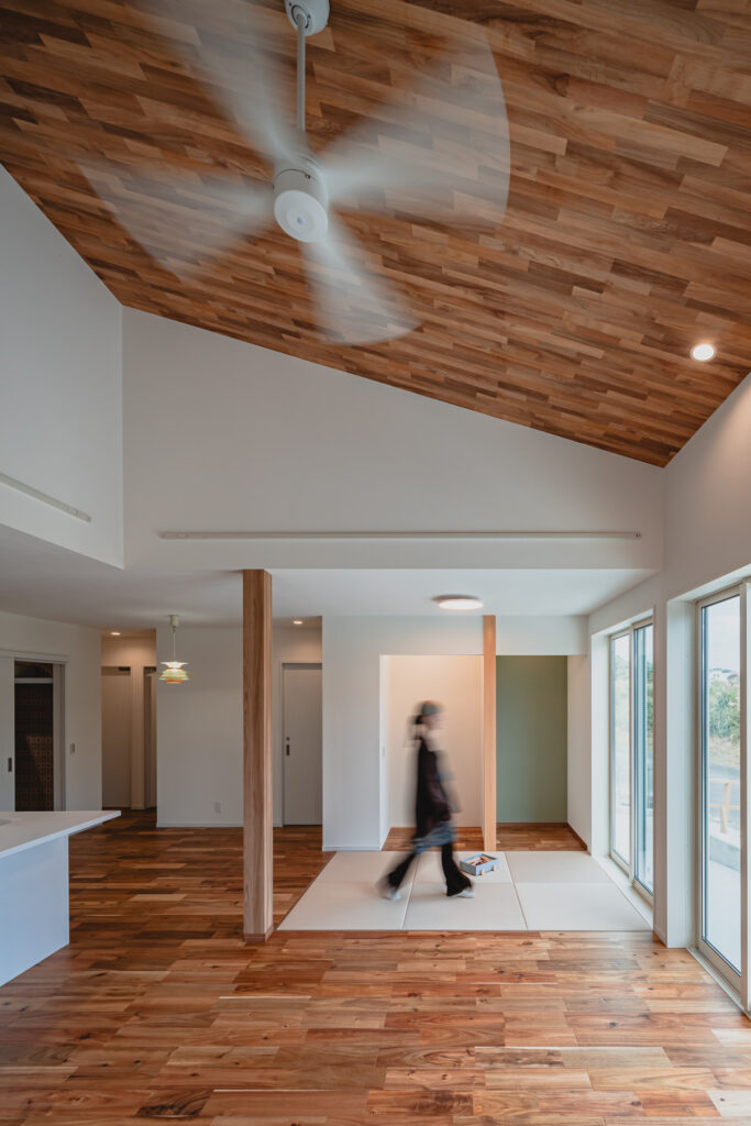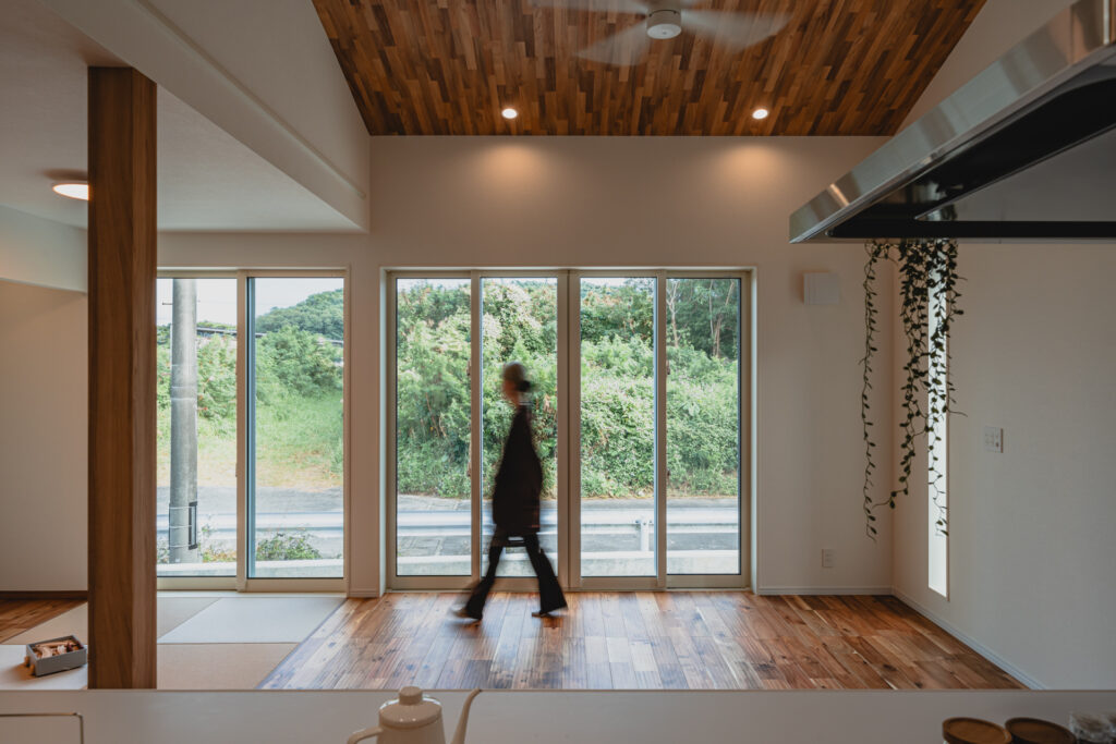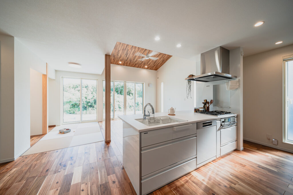 リビング部分は勾配天井とし、天井には木目をあしらうことで、縦方向にも広がりを感じられる設えに。大きな掃き出し窓からはたっぷりと光が入り、外の緑を身近に感じられる、明るく心地よい空間となっています。隣接する畳スペースとも緩やかにつながり、くつろぎ方の幅が広がるLDKに仕上がりました。
