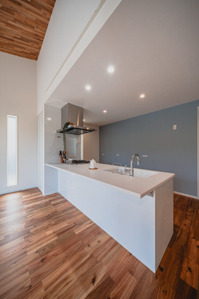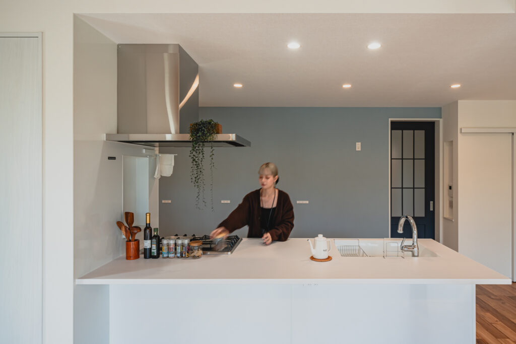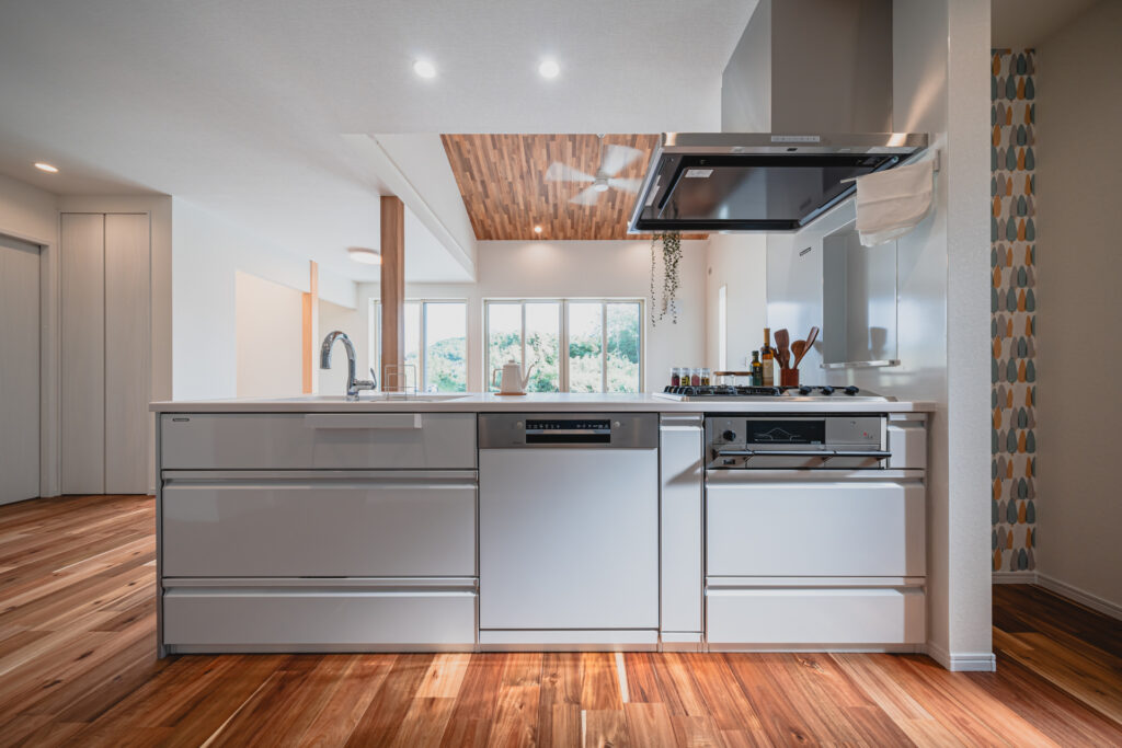 キッチンはアイランド型を採用。調理や配膳がしやすい配置に。正面にはリビング全体が見渡せるため、会話を楽しみながら家事ができるのも魅力です。