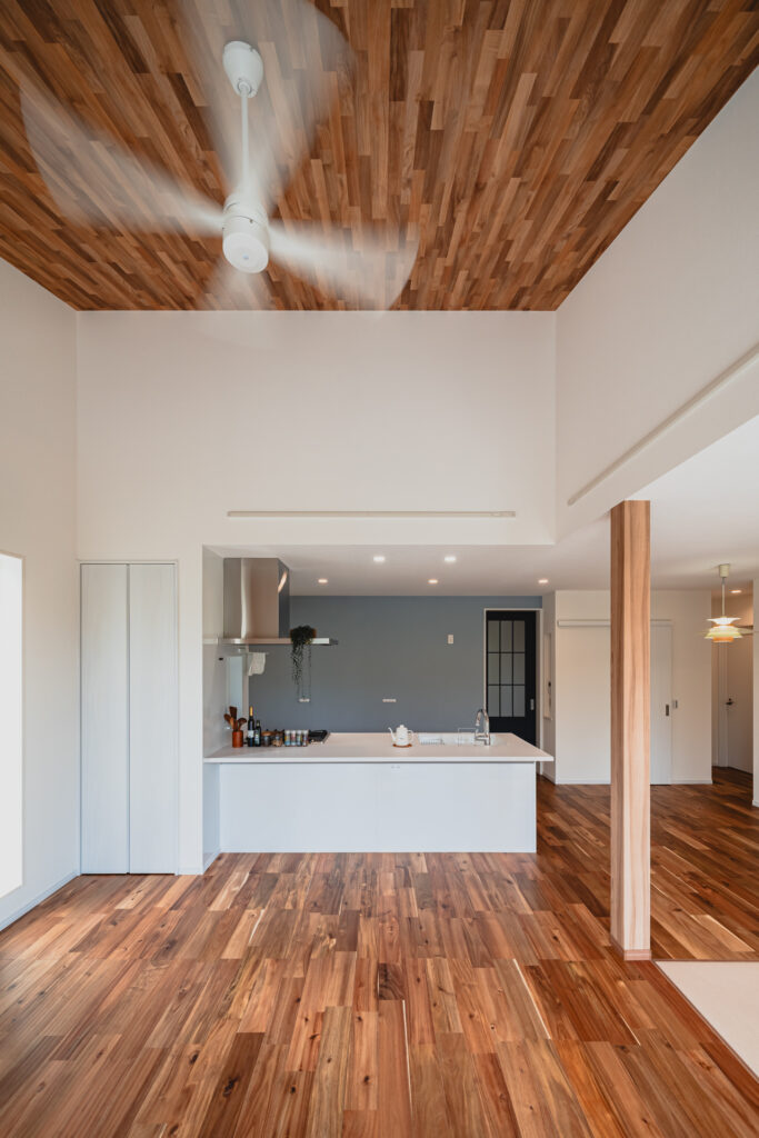 住まいの中心となるLDKは、ゆとりある広さを確保した一体空間。キッチンからダイニング、リビングまでが自然につながり、家族それぞれが思い思いの時間を過ごしながらも、気配を感じられる間取りです。