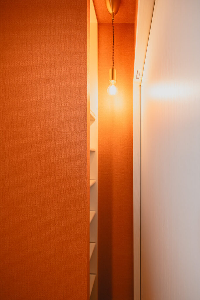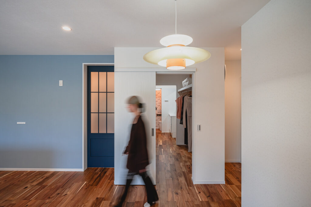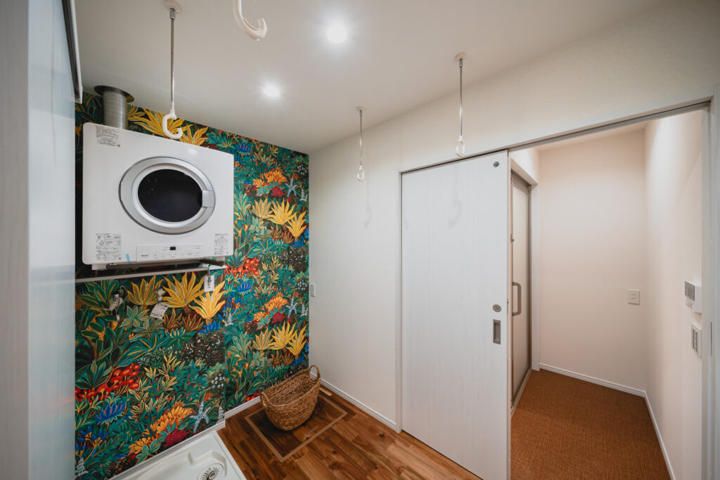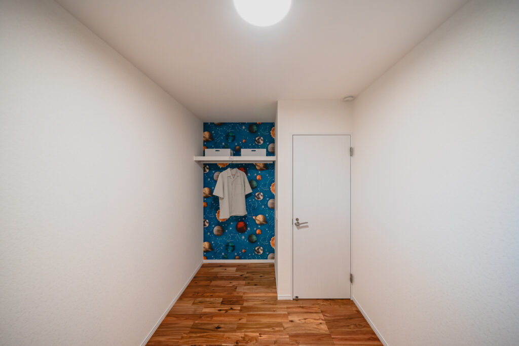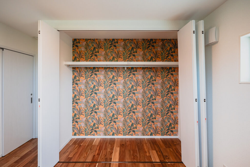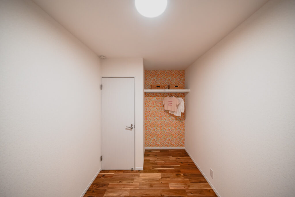 LDKからそのままアクセスできる位置に設けたファミリークローゼットは、日々の動線を意識した使いやすい空間です。壁面には柄のあるクロスを取り入れ、収納スペースでありながら、思わず気分が上がるような遊び心もプラスしました。