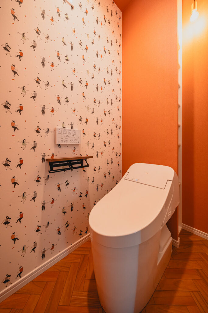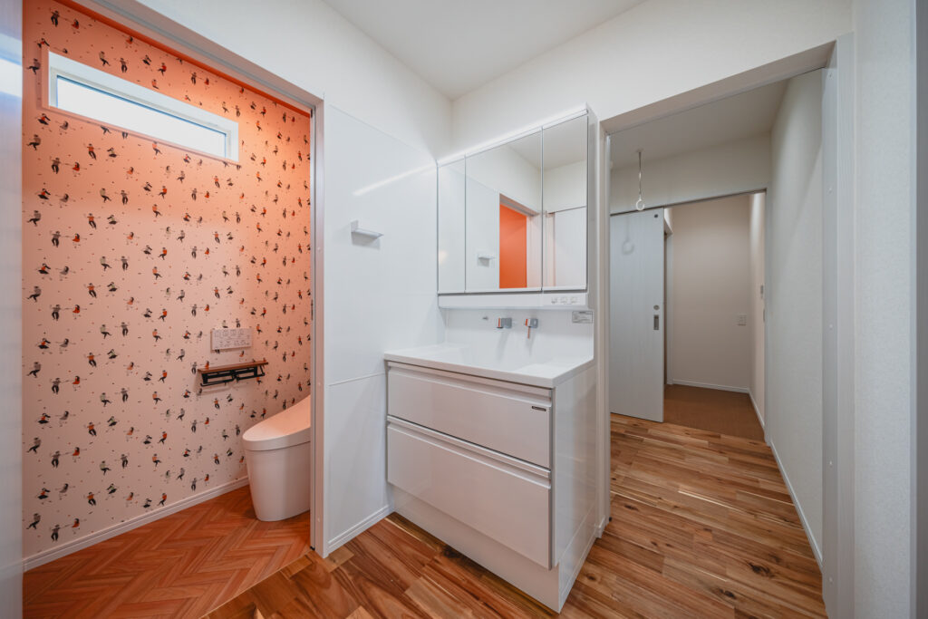 回遊動線の途中に配置したお手洗い。帰宅後の手洗いも自然な流れで行えます。LDKやファミリークローゼットともつながることで、朝の身支度や帰宅後の手洗いも自然な流れで行えます。