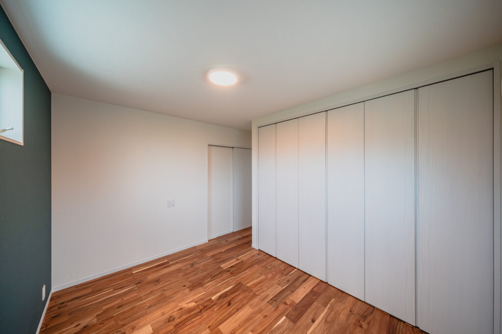 LDK側に配置した子ども部屋はオープン棚とハンガーパイプを組み合わせ、使いやすさにも配慮しました。