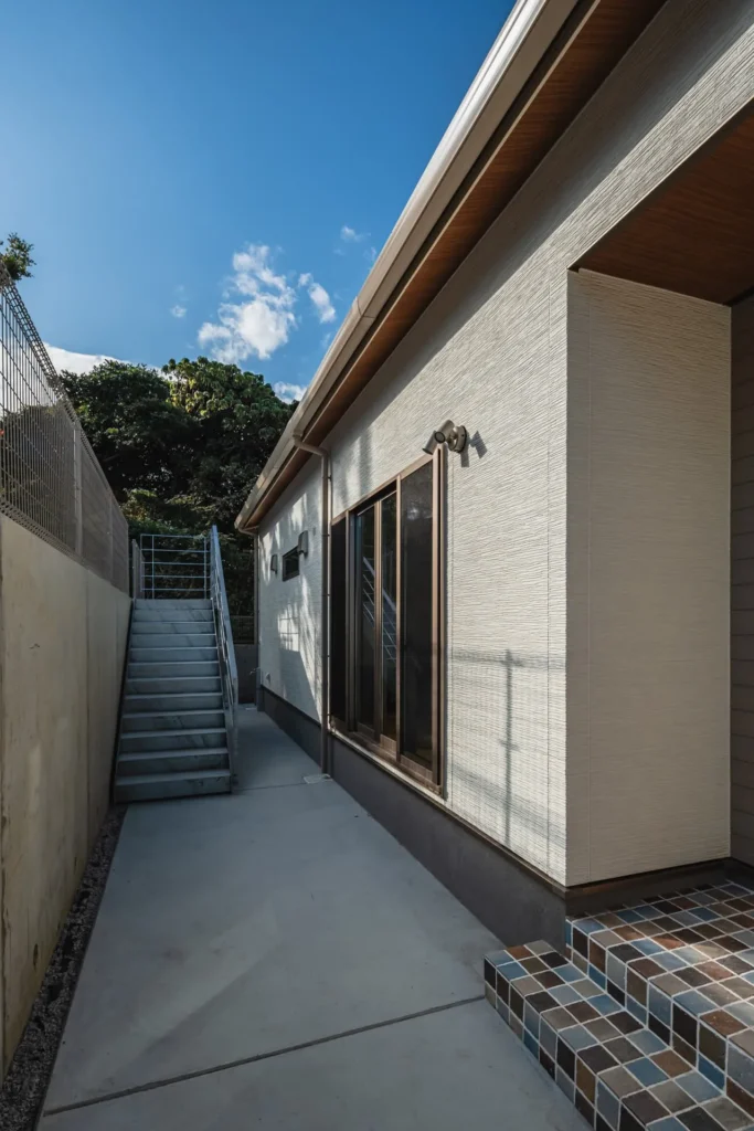 ナチュラルな外壁に瓦屋根が映える外観。平屋ならではの落ち着いた佇まいに、窓の配置を工夫することでプライバシーを確保しつつ、モダンな印象を与えています。