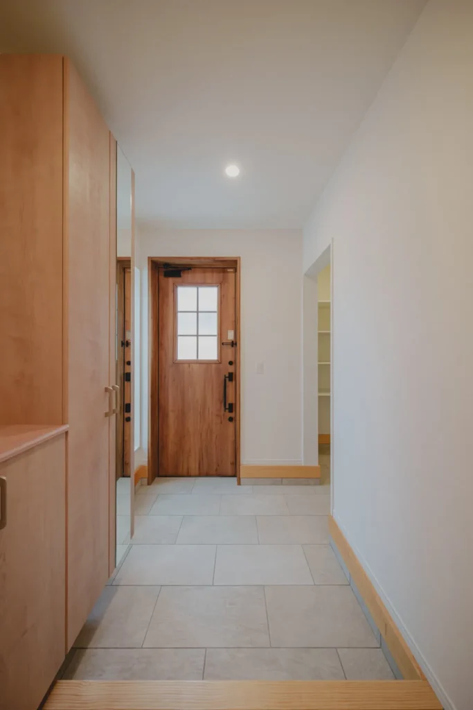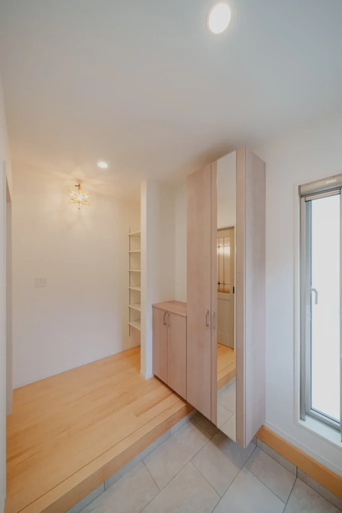 星形の照明がお出迎え。玄関横には大容量の収納スペースとL字型のシューズクロークを確保。玄関ホールにも収納を設けているので、通勤バッグや学校で使う持ち物などを置く事も可能です。