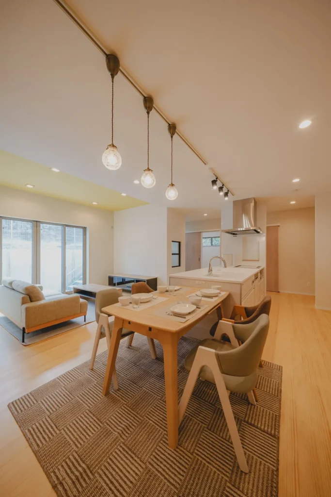 20帖の広々としたLDKは、家の中心として家族が集う開放的な空間。折上げ天井が空間に奥行きをもたらします。