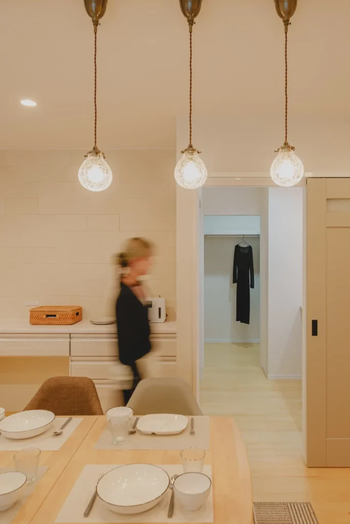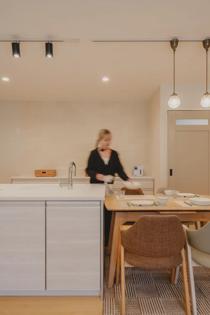 横並びダイニングは、配膳や片付けの効率が抜群。広々とした1800mmサイズのテーブルを置いても余裕があり、家族で囲む食卓を彩ります。