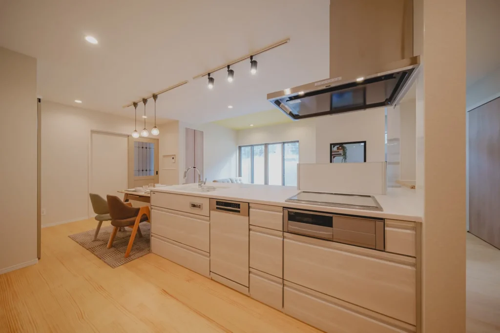 対面式のフルフラットキッチンを採用。背面にはカップボードを配置し、最小限の歩数で調理ができる機能的なキッチン空間を実現しました。