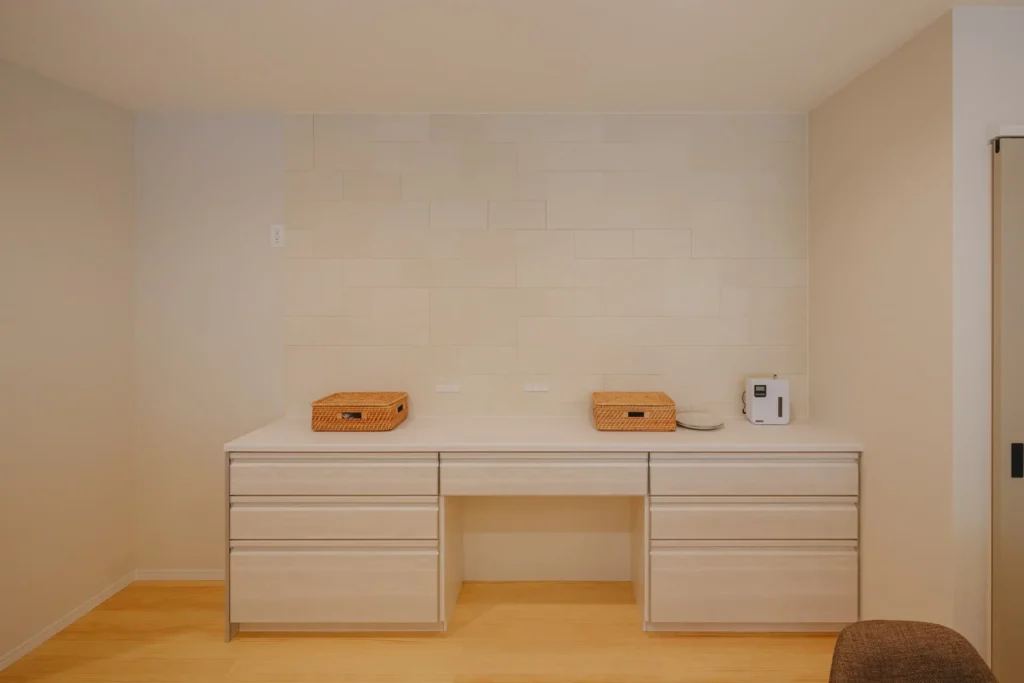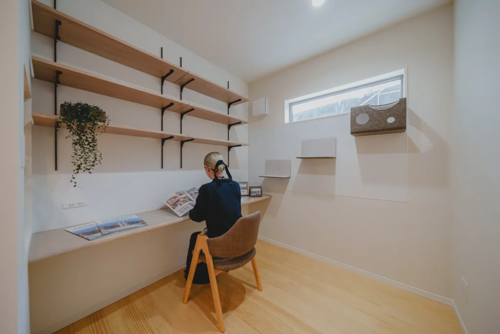 リビングの一角には、家族の気配を感じながら作業ができるオープンな書斎を配置。お子様の宿題スペースや、ちょっとしたPC作業に最適な場所です。