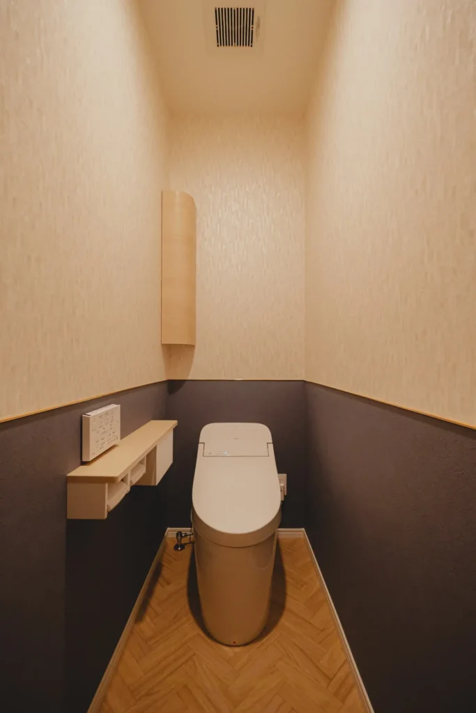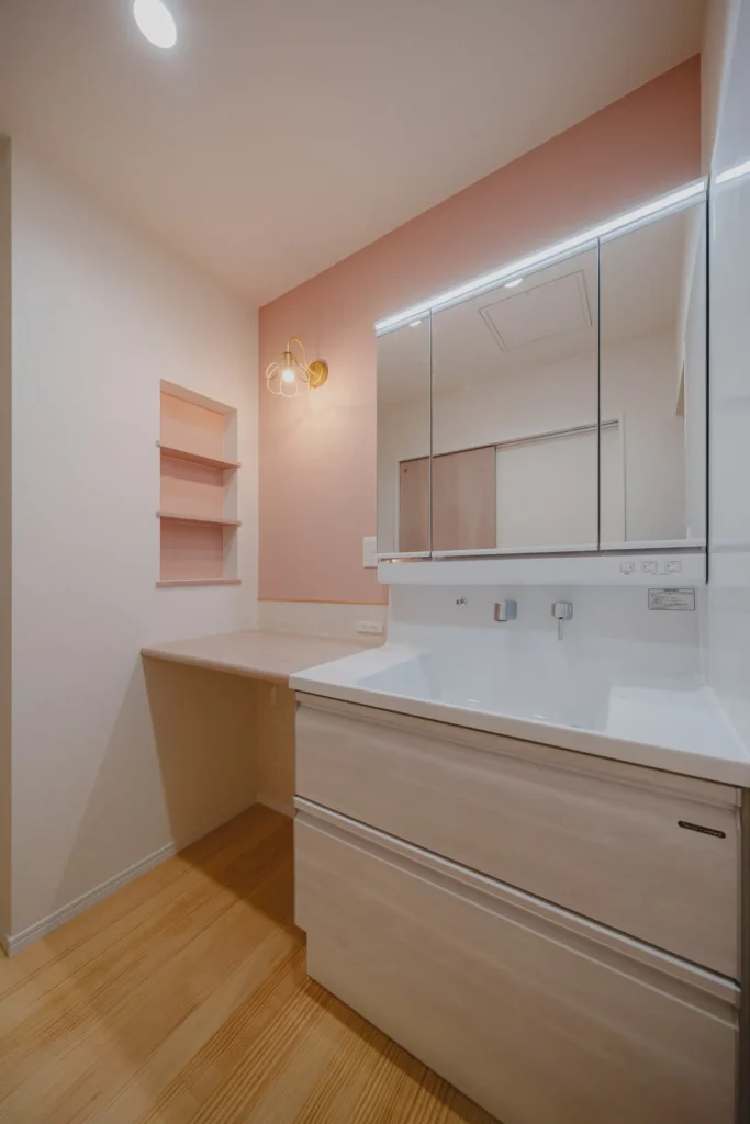 脱衣室から独立させた洗面ルームは、来客時も気兼ねなく使っていただけます。ワイドなカウンターとニッチを備え、朝の身支度も落ち着いて行えます◎