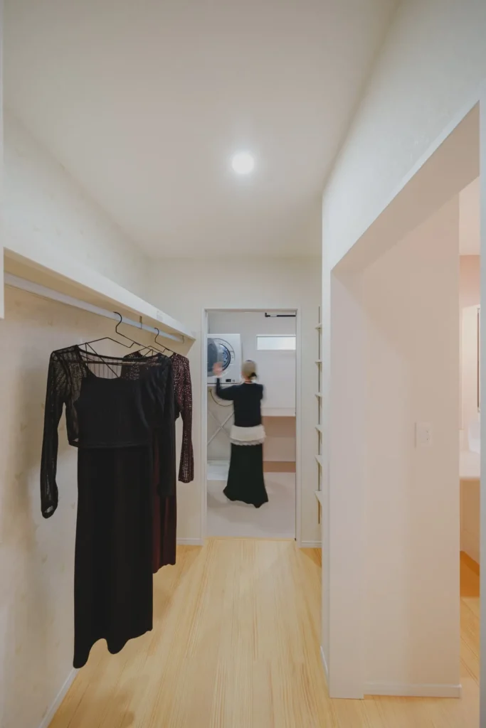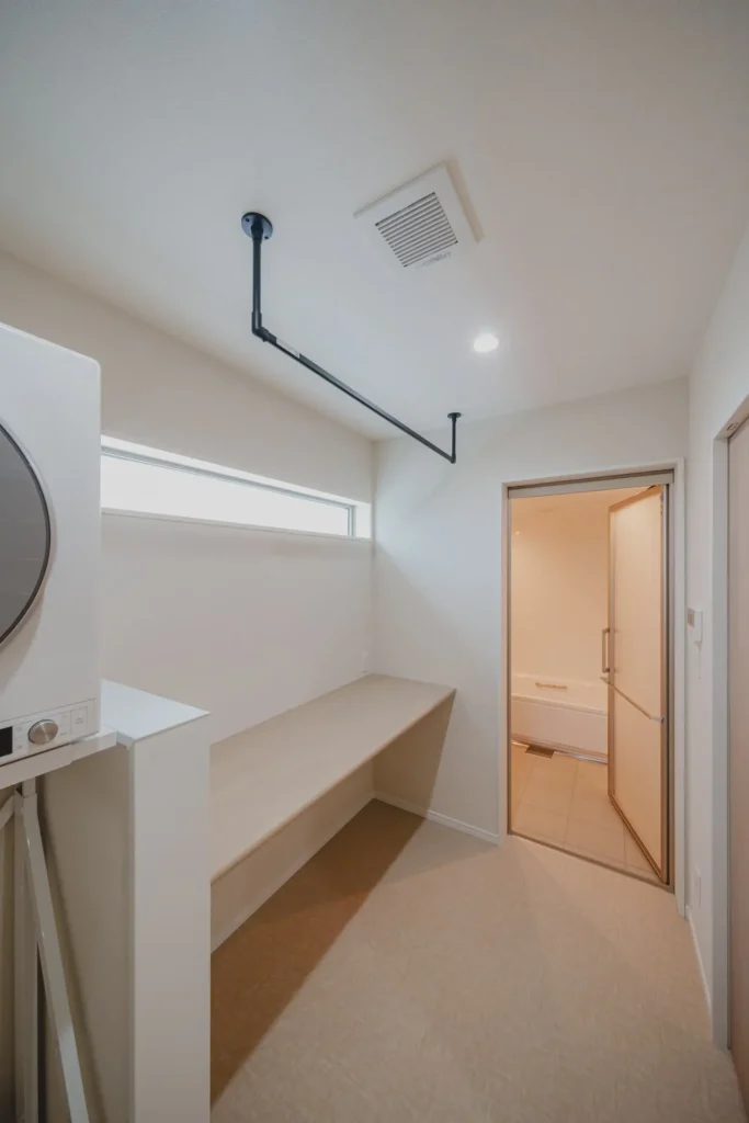 洗濯機からすぐ横のハンギングバーへ「洗う→干す→たたむ」が完結する脱衣兼ランドリールーム。家事の時短を叶える、共働き世帯には欠かせないスペースです。
