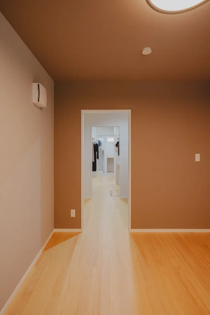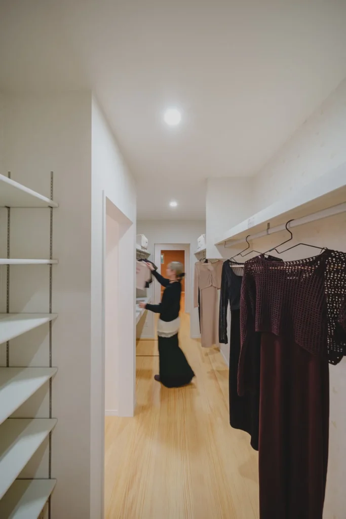 ランドリールームと寝室の間に位置するファミクロ。乾いた服をそのまま収納できる究極の家事動線は、平屋ならではの利便性です。