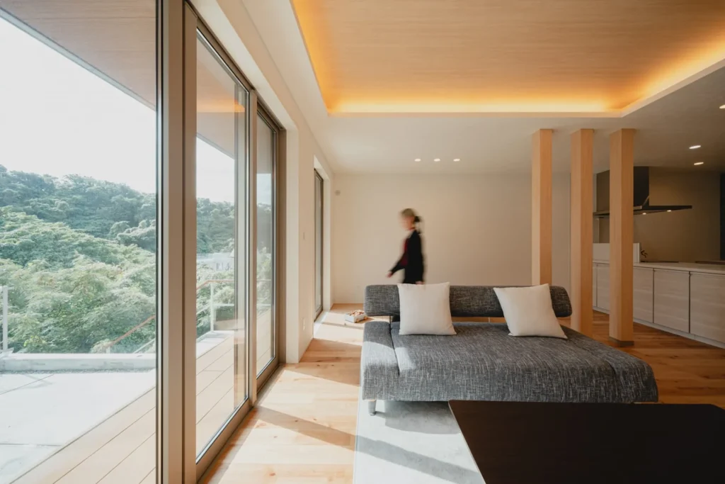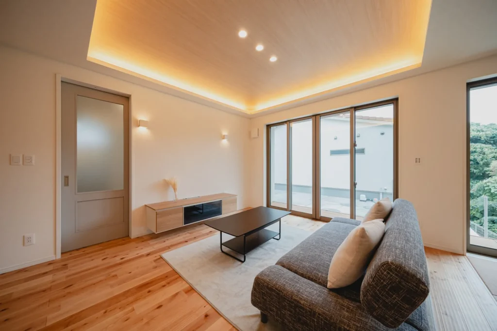 家族が集まるLDKは、24帖もの開放的な大空間。折り上げ天井が奥行きを演出し、北欧らしいニュアンスカラーで統一されたインテリアが、日々の忙しさを忘れさせてくれる穏やかな時間を育みます。