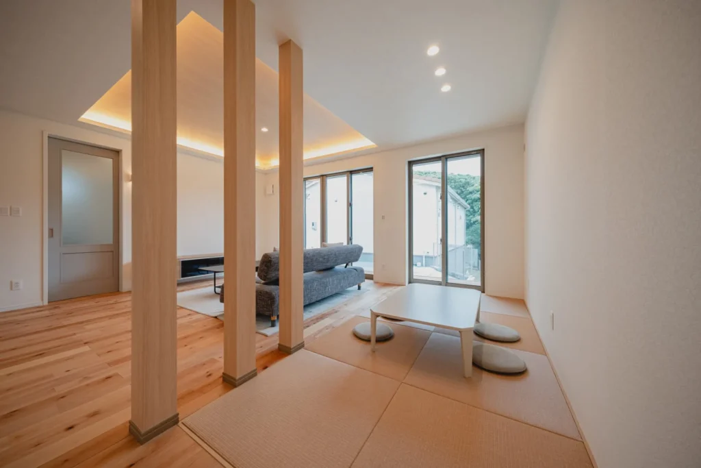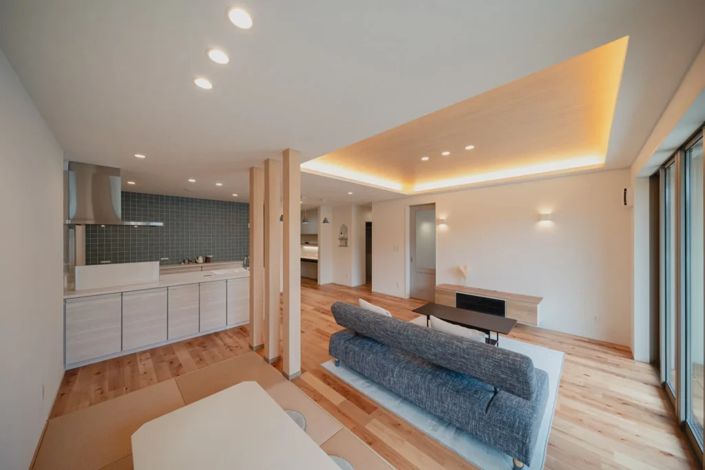 リビングの一角には、フラットにつながる畳スペースを配置。お子様のお昼寝や、家族のゴロゴロタイムに。多目的に使えるこの「余白」が、暮らしに心のゆとりを生み出します。
