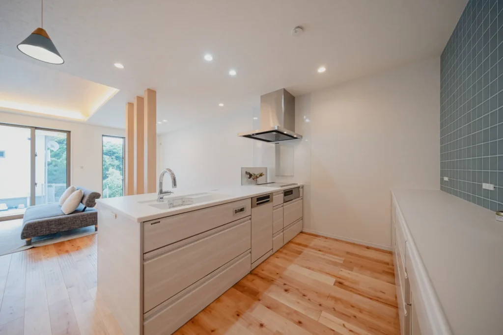 キッチンは、LDK全体を見渡せるような配置に。対面式なので、お料理中もお子様の宿題を見守ったり、会話を楽しんだり。背面のカップボードは収納力抜群で、生活感を隠しながらもおしゃれな空間を維持できます。