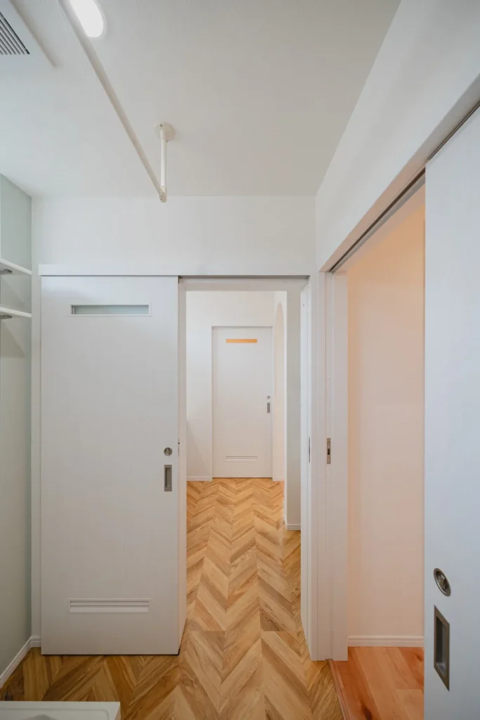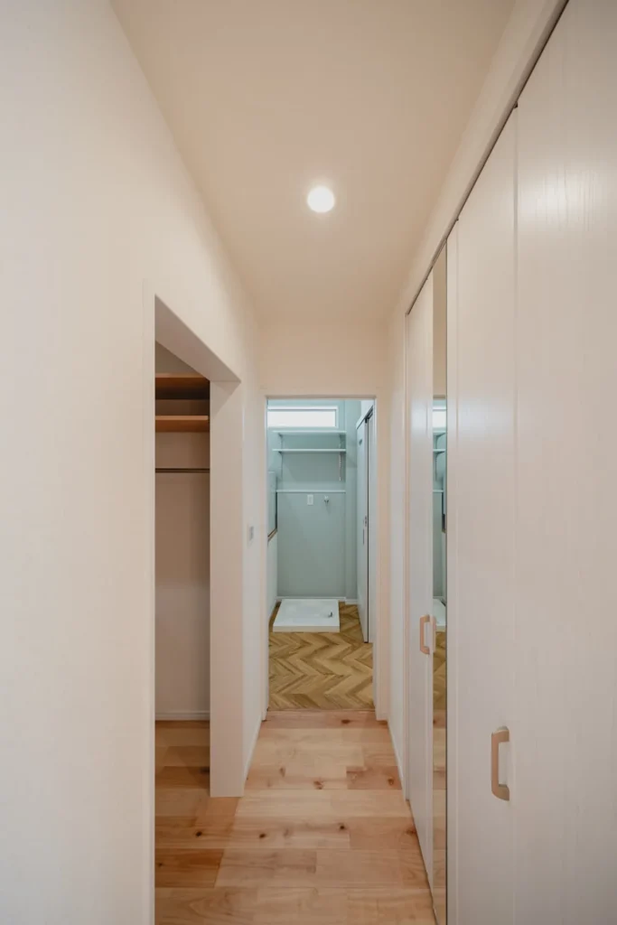 家の中心に位置するファミリークローゼット。「各部屋に片付けに行く」という手間を省き、洗濯物の片付けを一箇所で終わらせることができます。ここを通ってリビングや各部屋へ抜けられる回遊動線もポイントです。