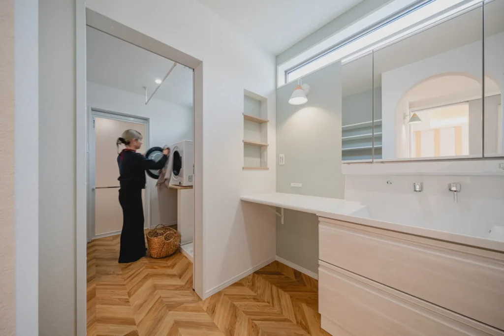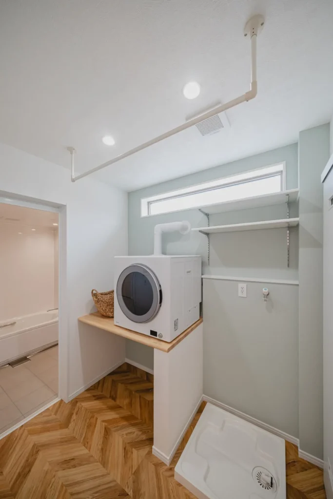 働くママの強い味方、ランドリールーム。脱衣室を兼ねたこのスペースには、室内干し用のハンギングバーと乾燥機を設置。天候を気にせず、夜間や外出中にも洗濯が完結する、家事時短の要です。