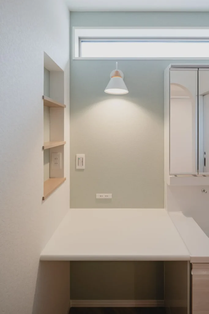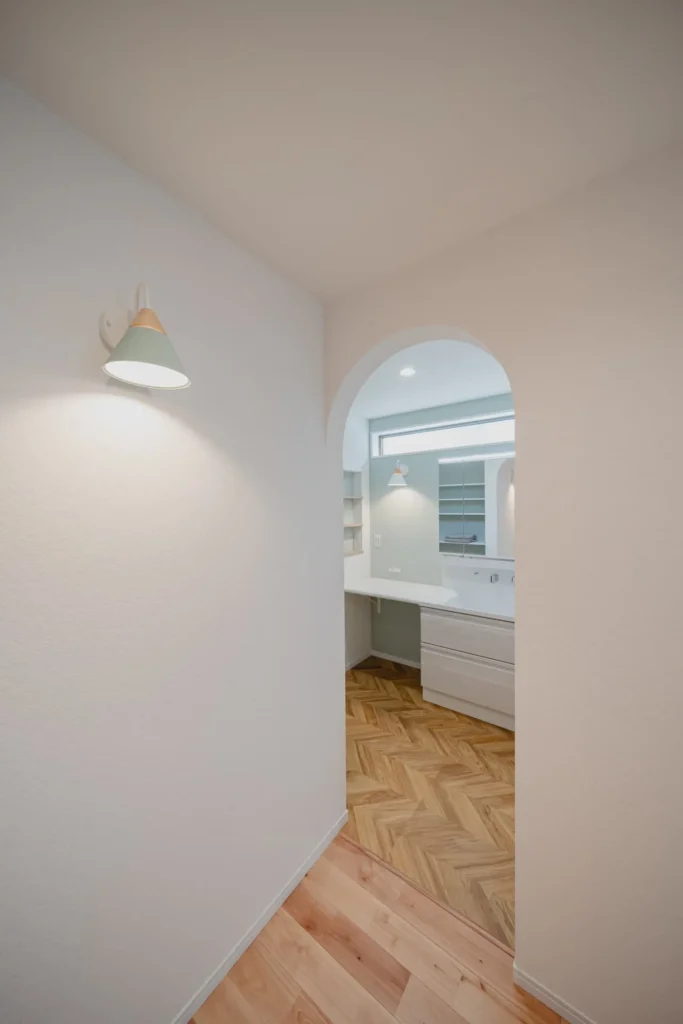 帰宅するとそのまま「ただいま手洗い」ができる洗面室へアクセスが可能です。ワイドなミラーと清潔感のあるデザインで、慌ただしい朝の身支度も優雅なひとときに変わります。
