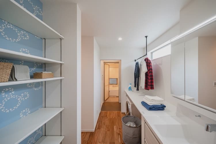 身支度の時間を豊かにする洗面室には、ワイドなカウンターとL型ハンギングバーを採用。散らかりがちな小物も美しく収まるよう収納棚も設けました。