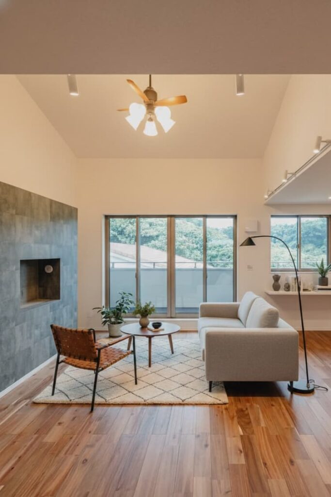 24帖もの大空間が広がるLDKは、上部を勾配天井にすることで圧倒的な開放感を演出しています。南側の大きな引き違い戸からは豊かな自然光が降り注ぎます。